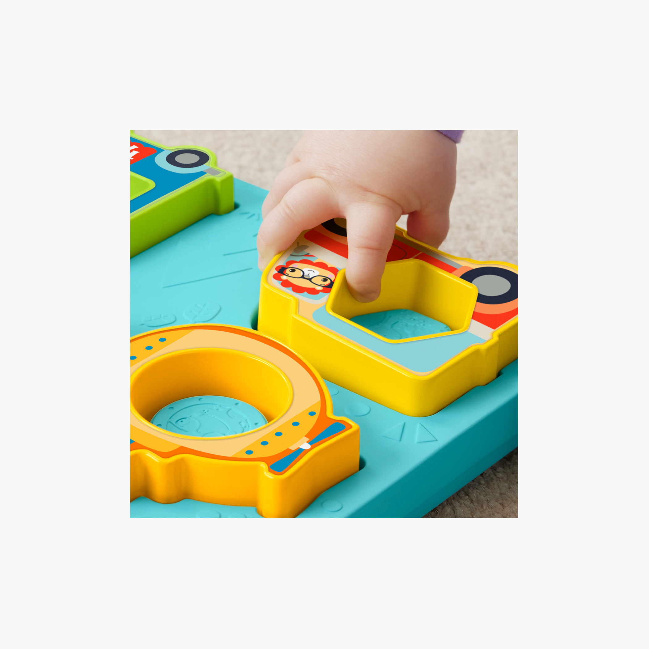 ضع قطع الألغاز والأشكال في القاعدة لتفعيل أصوات المركبات والحيوانات، بالإضافة إلى الأضواء