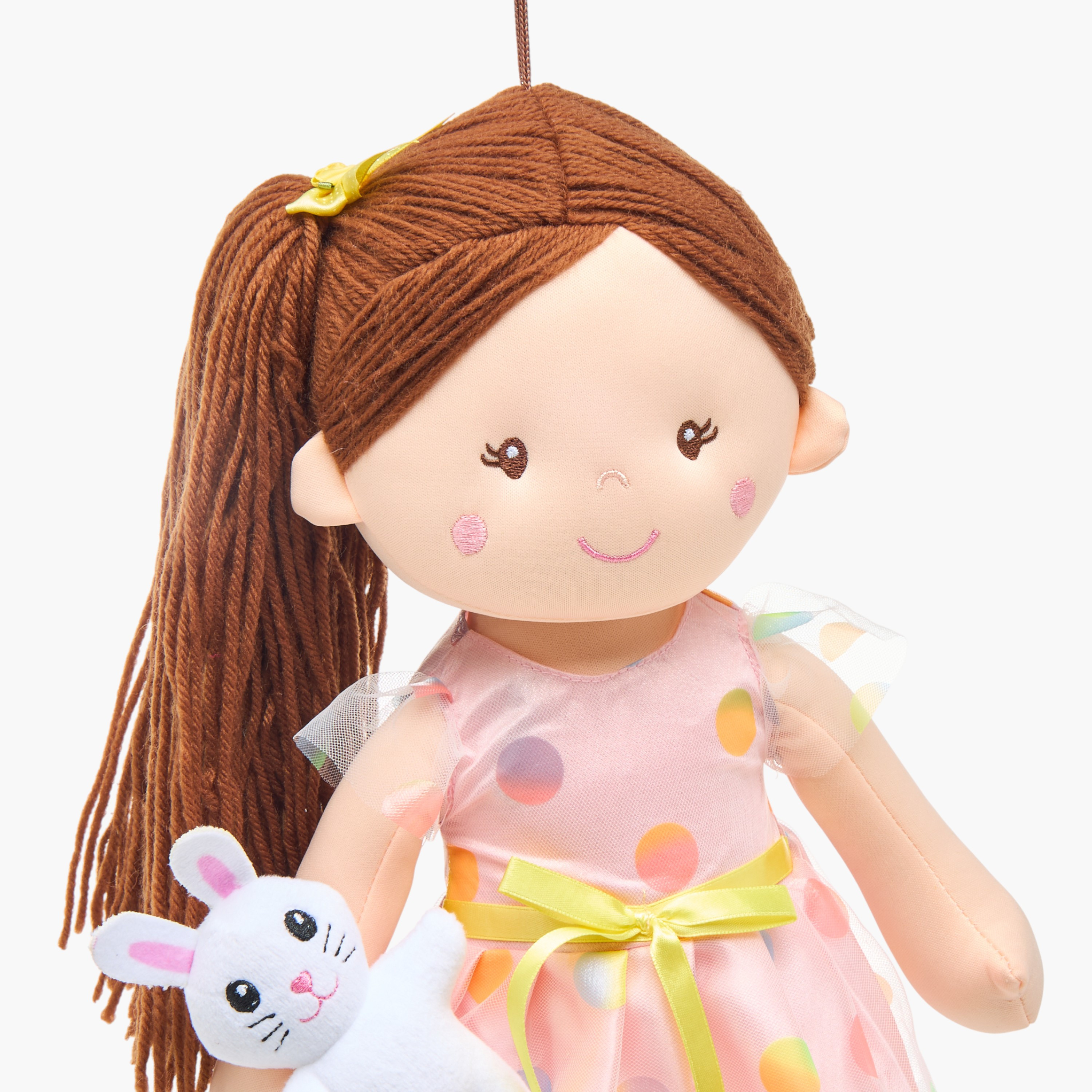 استمتعي بساعات من المرح واللعب الخيالي مع هذه الدمية القماش الساحرة. تتميز بتصميمها اللطيف وفستانها المزين بنقاط ملونة، بالإضافة إلى أرنبها الصغير الظريف. صُنعت الدمية من مواد ناعمة لتوفير الراحة، وتشجع الأطفال على نسج القصص الإبداعية وتنمية مخيلتهم.