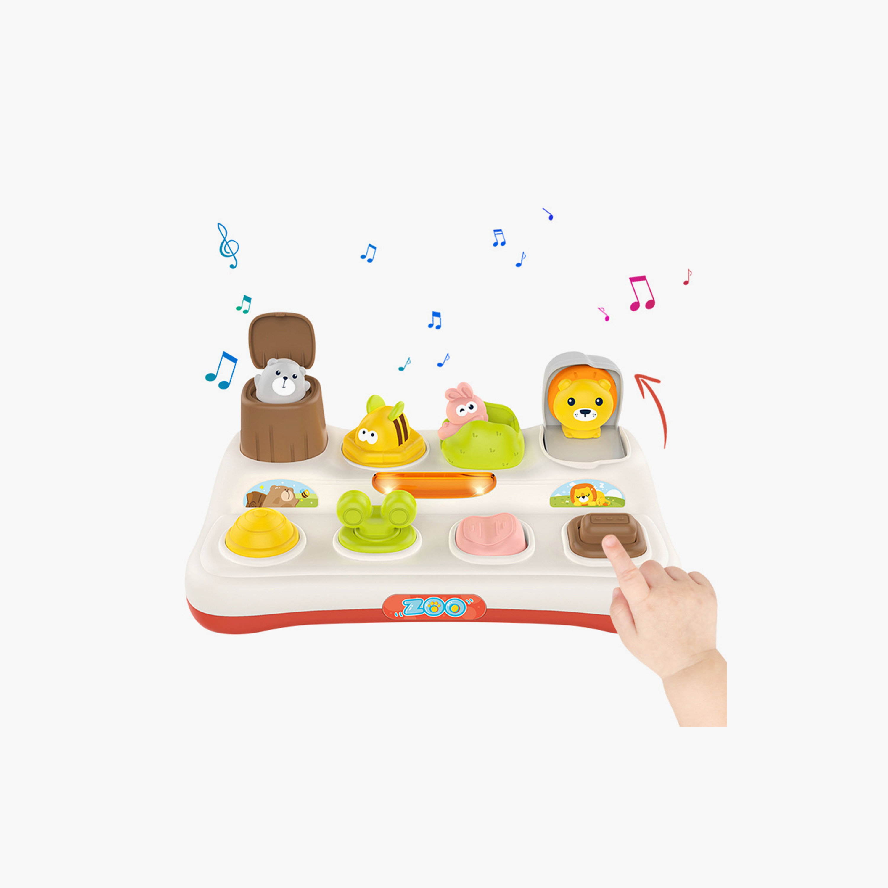 حيوانات تفاعلية منبثقة: تحتوي اللعبة على عدة أزرار ومقابض. عندما يضغط الطفل على هذه الأزرار أو يديرها أو يدفعها، يظهر حيوان مختلف من مكانه.