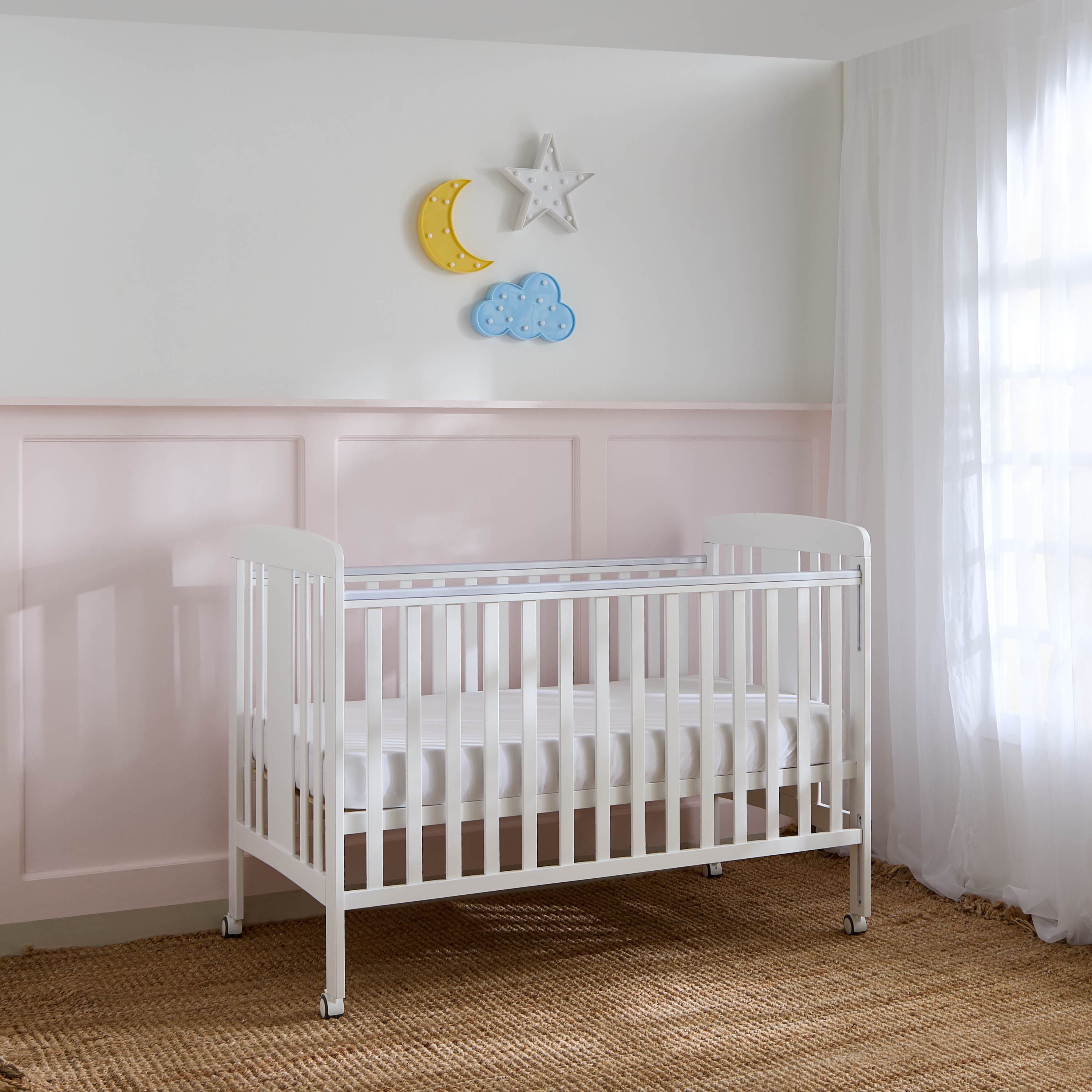 مهد أطفال مصنوع من الخشب عالي الجودة، مصمم لراحة طفلكِ. يتميز بجانب قابل للطي لتسهيل الوصول للطفل، بالإضافة إلى ارتفاع قابل للتعديل ليناسب مراحل نمو طفلكِ. يوفر المهد مساحة آمنة و مريحة لنوم هادئ، مع قضبان حماية من التسنين.