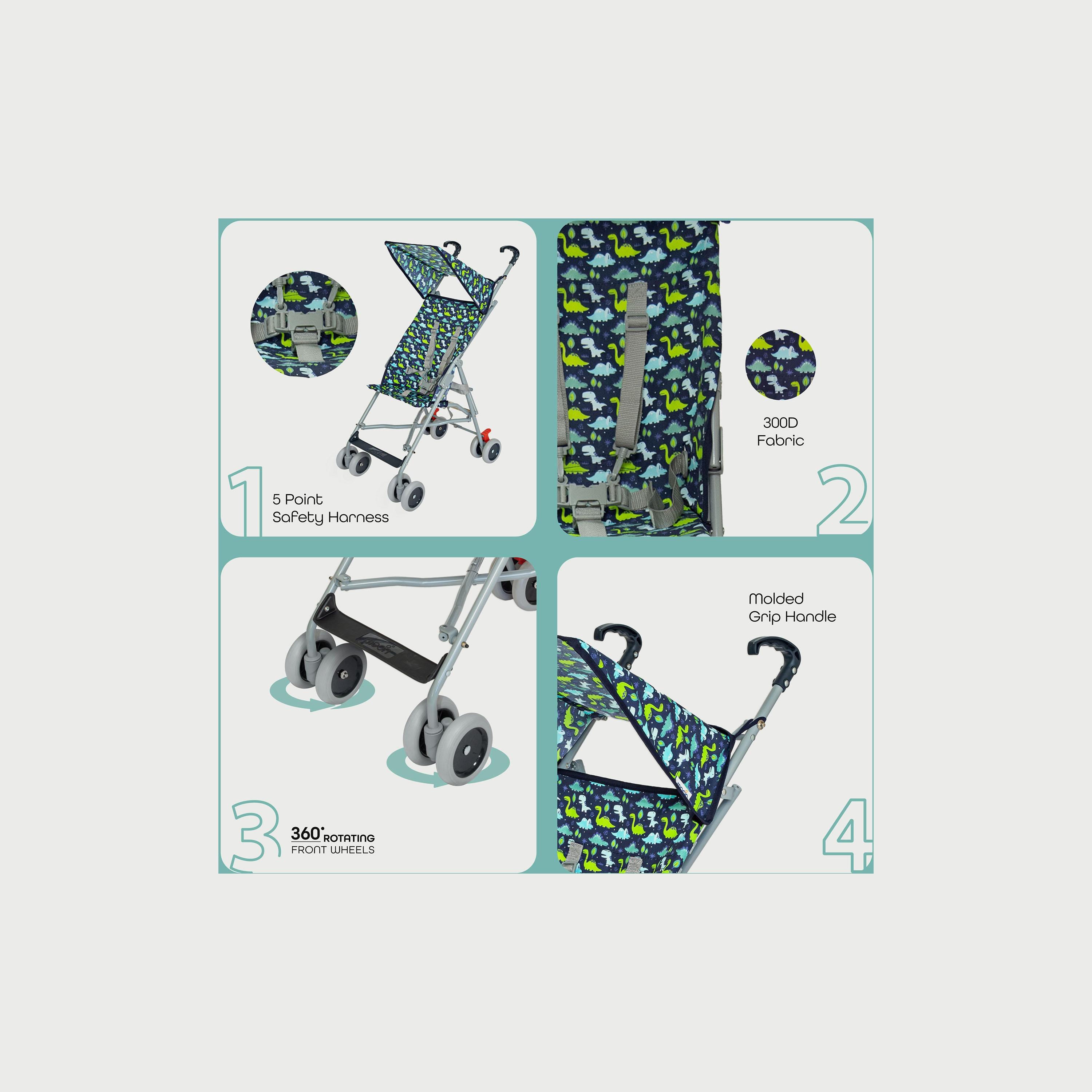 نقدم لكِ عربة الأطفال جيت باجي بتصميم بطبعة دينو من مون لتكون الرفيق المثالي لطفلكِ الصغير. مصممة لتوفير أقصى درجات الراحة لطفلكِ. تتميز بإطار من الألومنيوم خفيف الوزن ومقبض قابل للتعديل وحزام أمان مثبت بـ 5 نقاط لمزيد من الأمان. يسهل مسند القدم القابل للتعديل والمقعد القابل للإمالة ضبط عربة الأطفال حسب حجم طفلكِ ومستوى الراحة المناسب له. توفر المظلة الكبيرة الحماية من أشعة الشمس والرياح بينما تسهل سلة التخزين الكبيرة تخزين مستلزمات طفلكِ الأساسية والوصول إليها. سهلة الطي والتخزين لتكون مثالية للرحلات إلى الحدائق أو الشاطئ. تتميز بتصميم أنيق عالي الجودة مما يجعلها الخيار الأمثل للأمهات والأباء الذين يرغبون في الحفاظ على أطفالهم آمنين ومرتاحين.