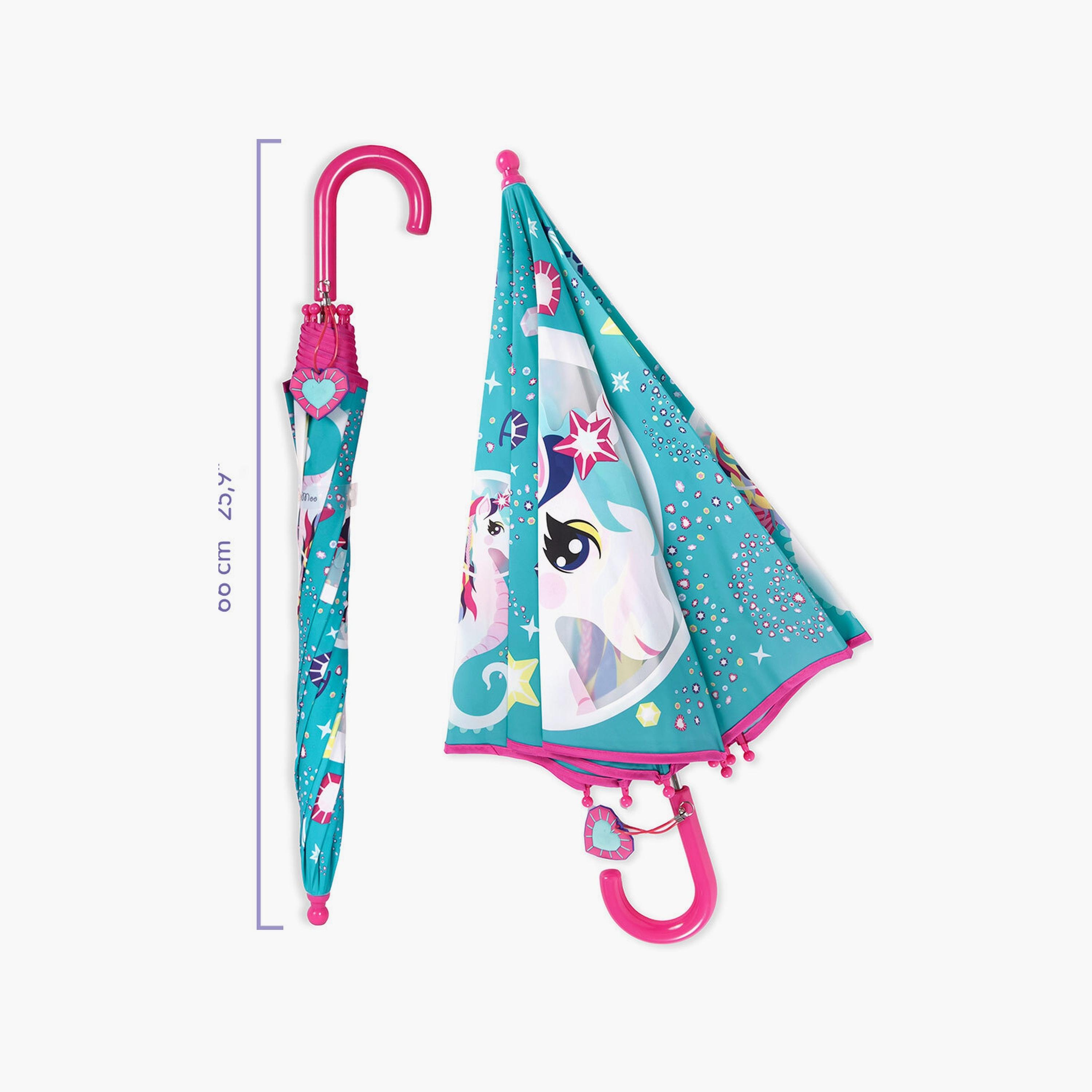 Introducing the Biggdesign Milkyway Ayris Printed 8 Ribs Folding Umbrella in Blue, a stylish and practical accessory for kids aged 7-10. This charming umbrella features an Ayris pattern and a pink cane-shaped handle designed for ergonomic use. With its manual open/close mechanism, children can easily manage it, while the snap strap ensures secure closure. The umbrella's 8-ribbed design includes safety tips to protect young eyes. Crafted with a white metal frame and a plastic J-handle adorned with a silicone crystal heart charm, it measures 19" x 8 panels and is made from 100% POE fabric. For longevity, clean regularly, store dry, and supervise use. Not suitable for children under 3 years old.
