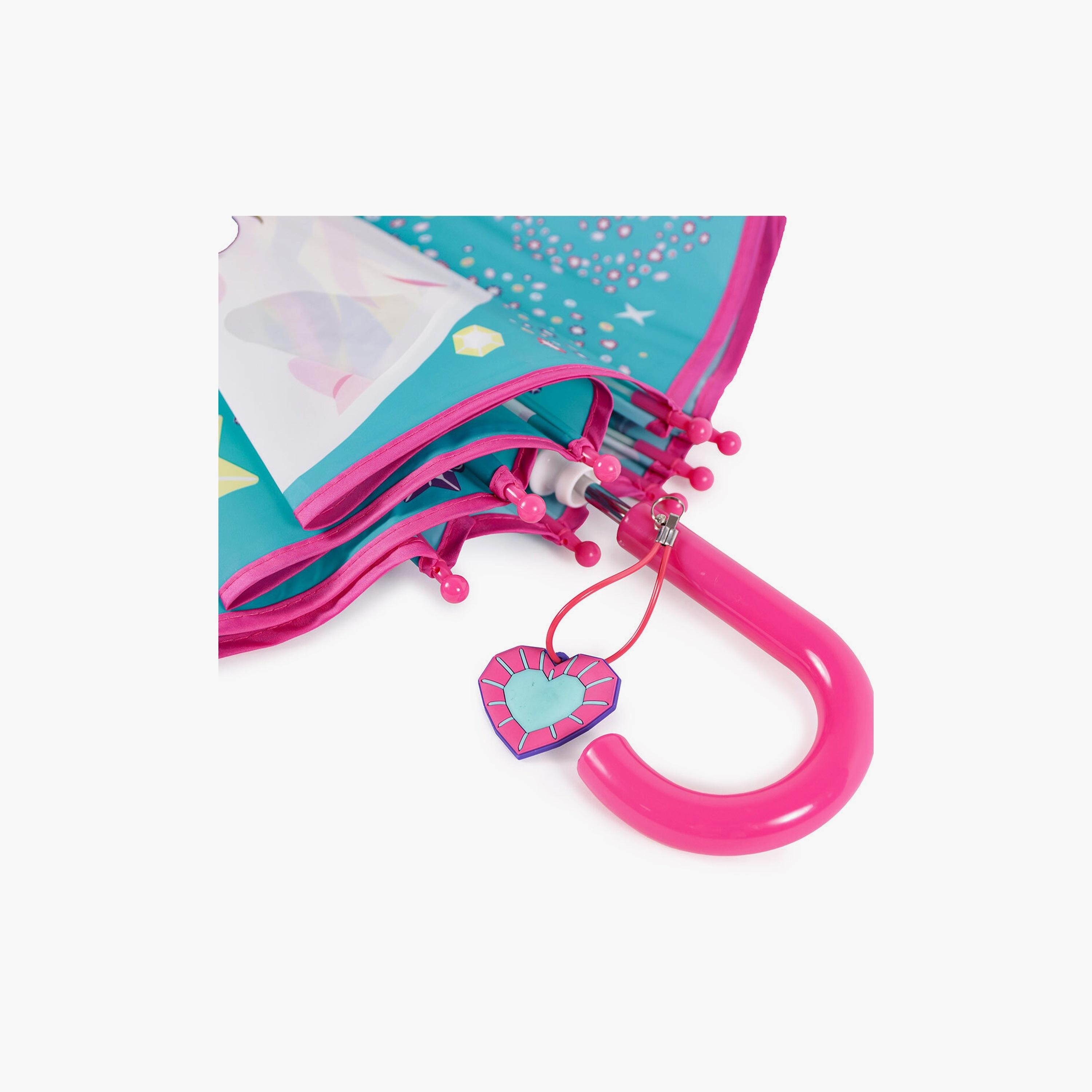 Stylish and Safe: The Ayris-patterned umbrella features safety tips on its 8 ribs, ensuring protection for children's eyes while they enjoy rainy days in style., Ergonomic Design: Specifically designed for children aged 7-10, it includes a pink cane-shaped handle for comfortable and easy handling, complete with a charming silicone crystal heart., Durable and Easy Maintenance: Made from 100% POE fabric with a sturdy white metal frame.