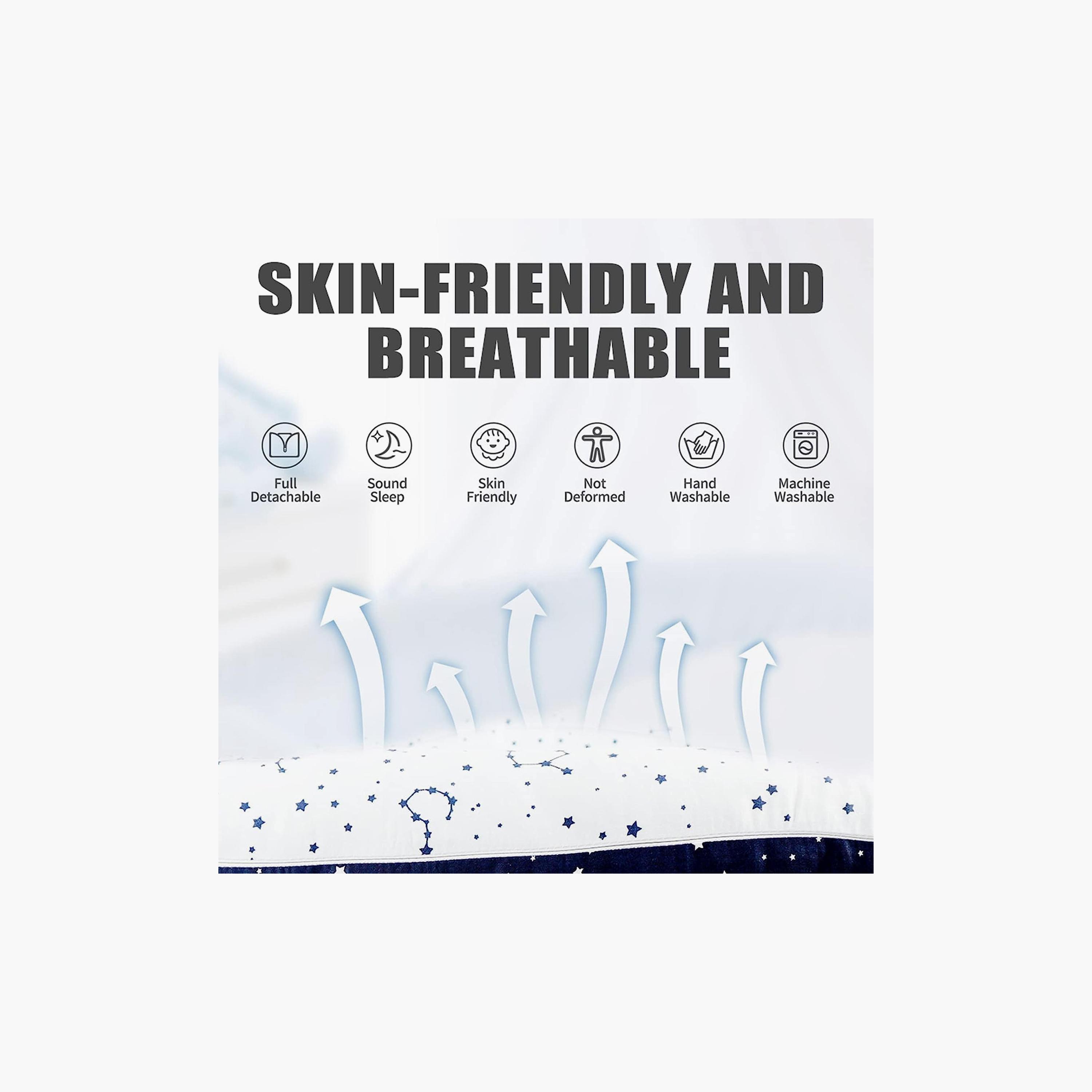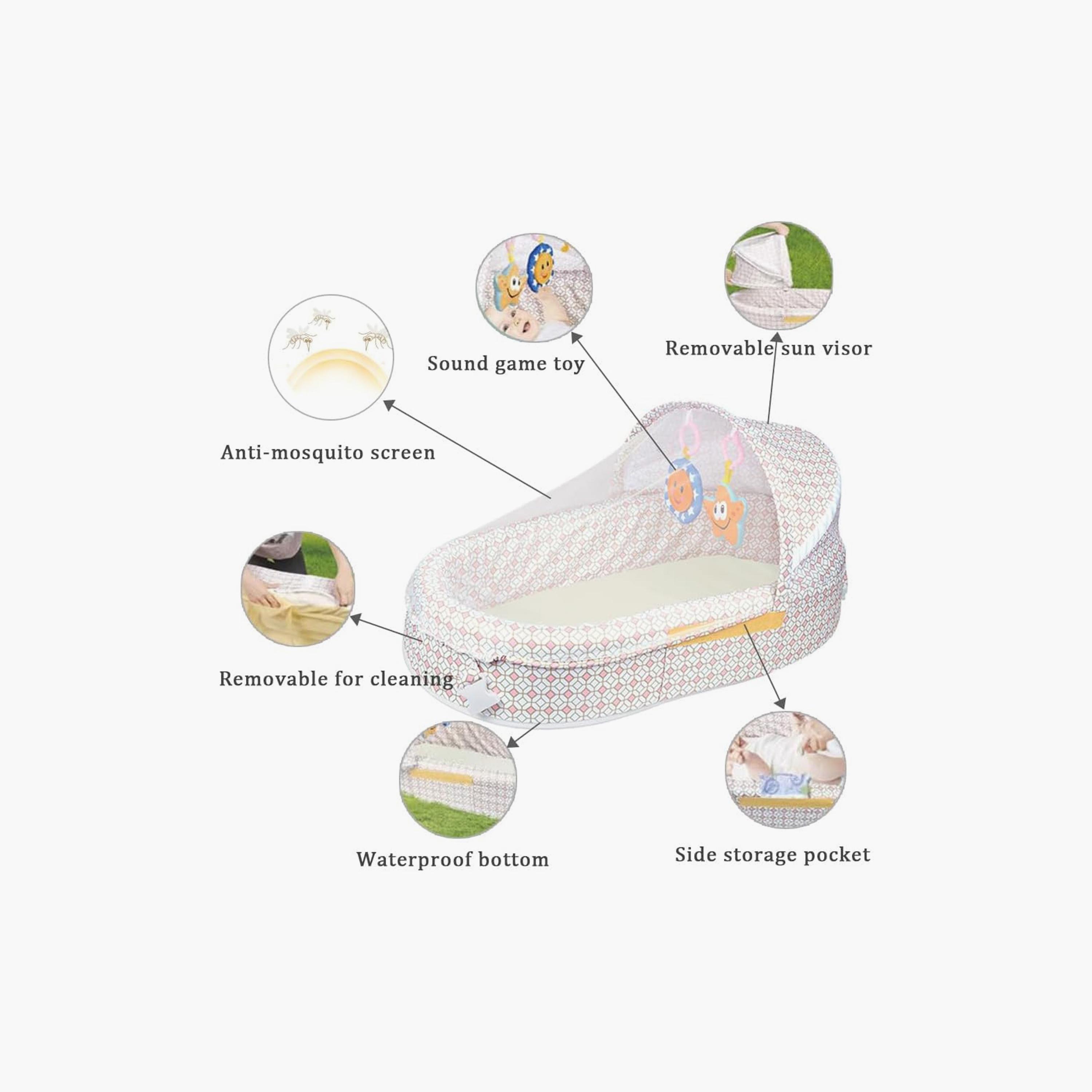 Perfect for Co-Sleeping: Firm side cushions prevent rolling, offering a safe co-sleeping solution or tummy time nest, with a compact, travel-friendly design., Premium Natural Cotton: Made from ultra-soft, breathable cotton to ensure a gentle touch on delicate skin and maintain airflow for a comfortable sleep environment., With Sounds & Songs | Water Resistant | Foldable, Bionic Design for Better Sleep: Simulates the mother's womb with a thick, soft bumper for enhanced security and comfort, promoting faster and more restful sleep.