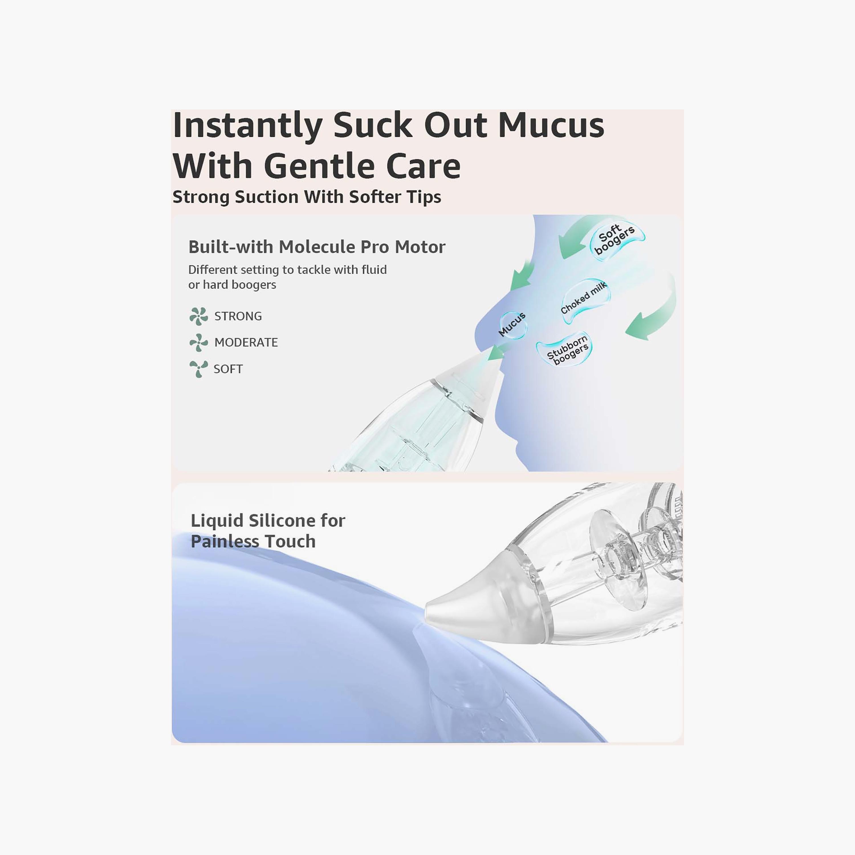 Efficient Suction: Features a powerful yet quiet motor designed to clear nasal congestion quickly and efficiently, making it ideal for use at home or on the go.