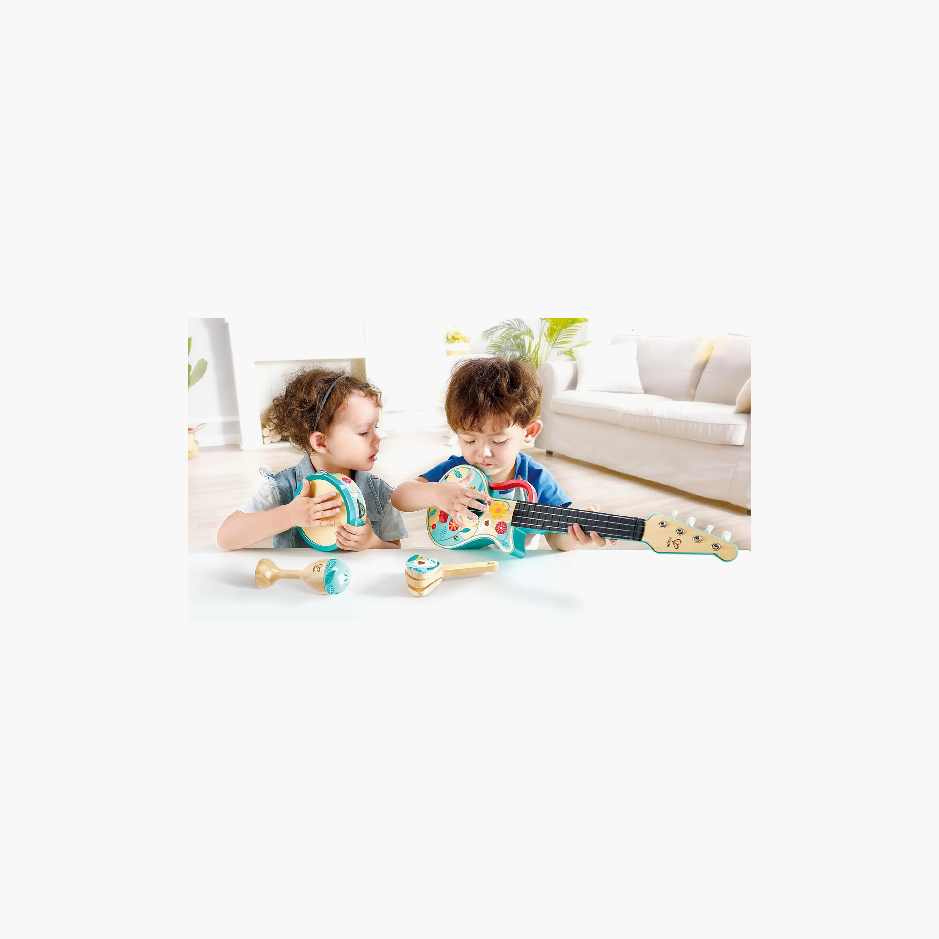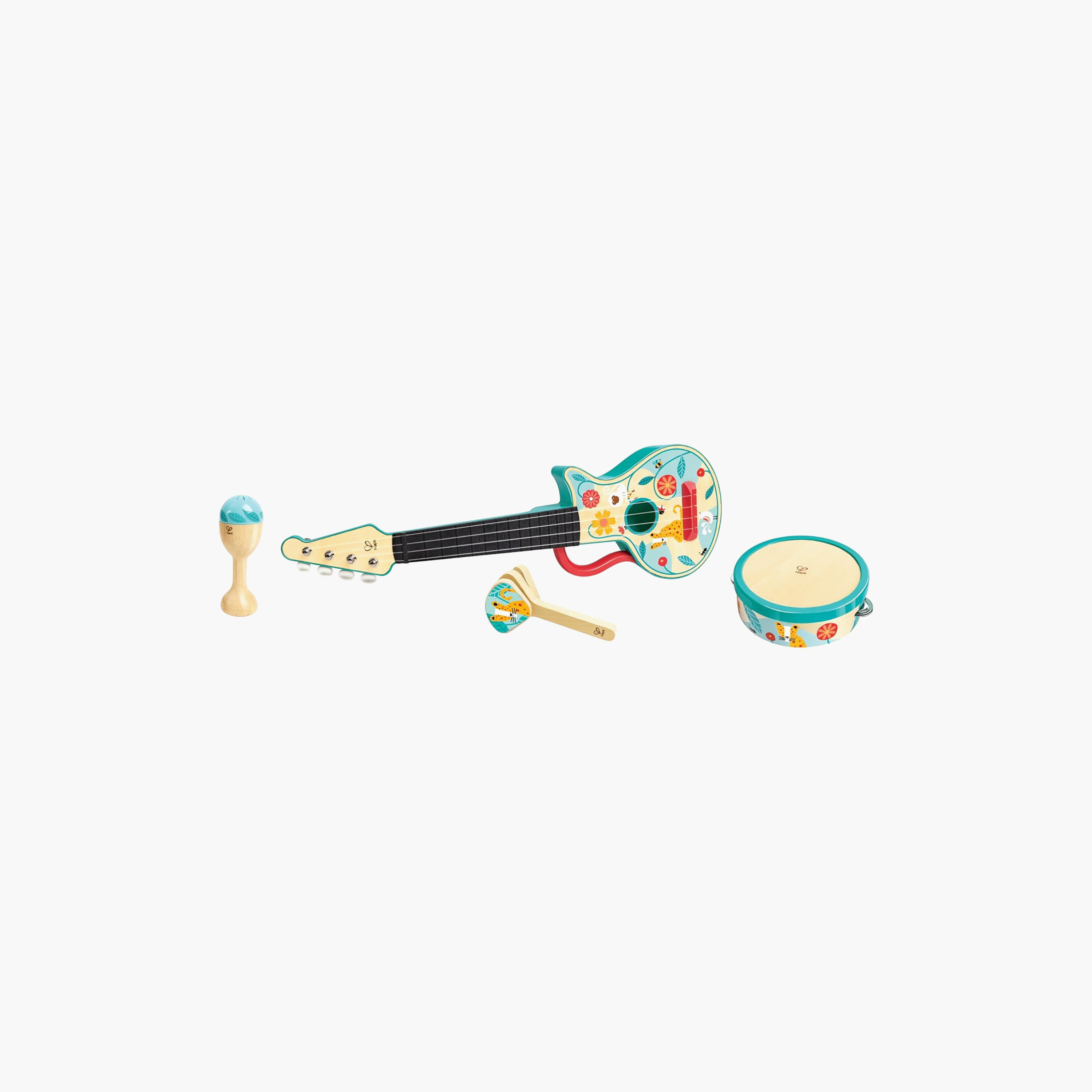 The Hape 4-in-1 Ukulele Set offers a fun musical experience with a maracas, castanets, tambourine, and a real-string ukulele. Designed to foster musical skills, rhythm, and creativity, all instruments feature colorful, engaging motifs. Made from high-quality, child-safe wood with non-toxic finishes, this durable set is perfect for young music enthusiasts to explore, learn, and enjoy real music safely.