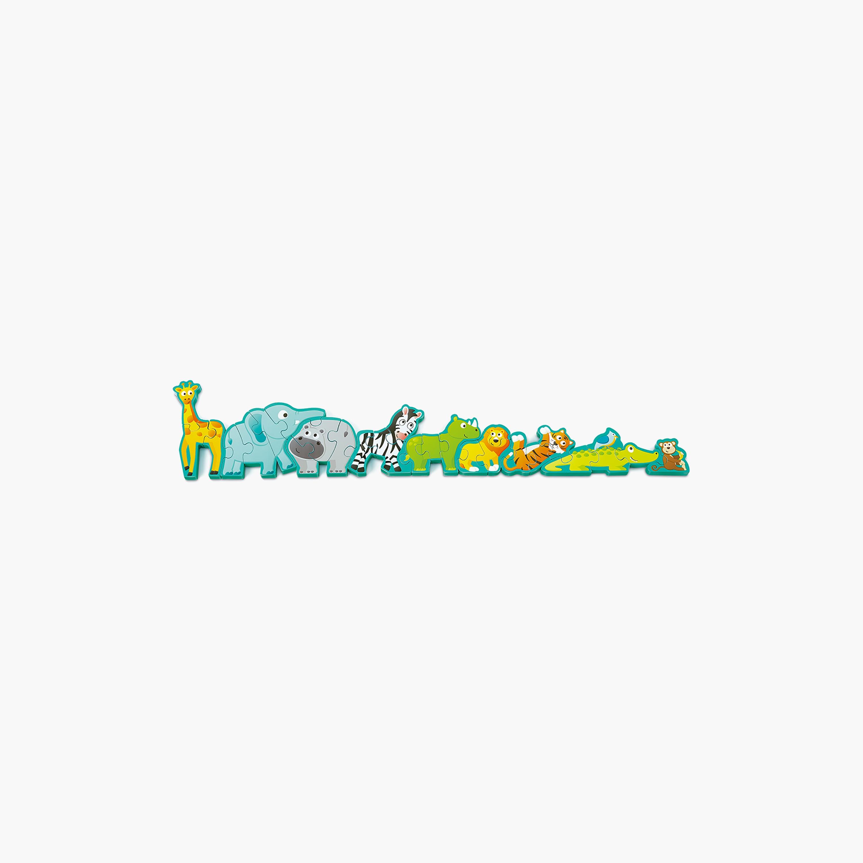 The Hape Parade Puzzle is great for developing animal and alphabet recognition, vocabulary and concentration. The 26-piece wooden puzzle game features a doubled sided theme, which includes 10 wild animals and 26 letters. You