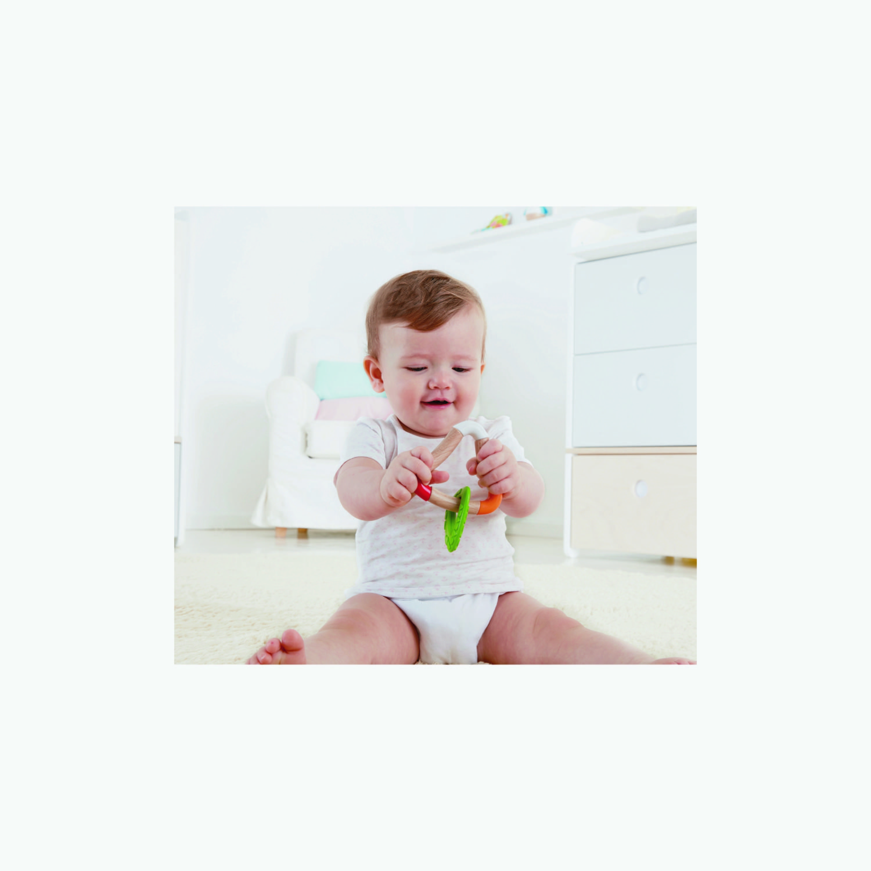 The teether features an easy-to-grasp handle made from smooth, comfortable wood, perfectly sized for little hands. This design encourages babies to hold the toy independently, promoting self-soothing and independent play. The handle's ergonomic shape ensures that even the smallest fingers can grip it securely, fostering a sense of confidence and autonomy in young children as they explore their environment.