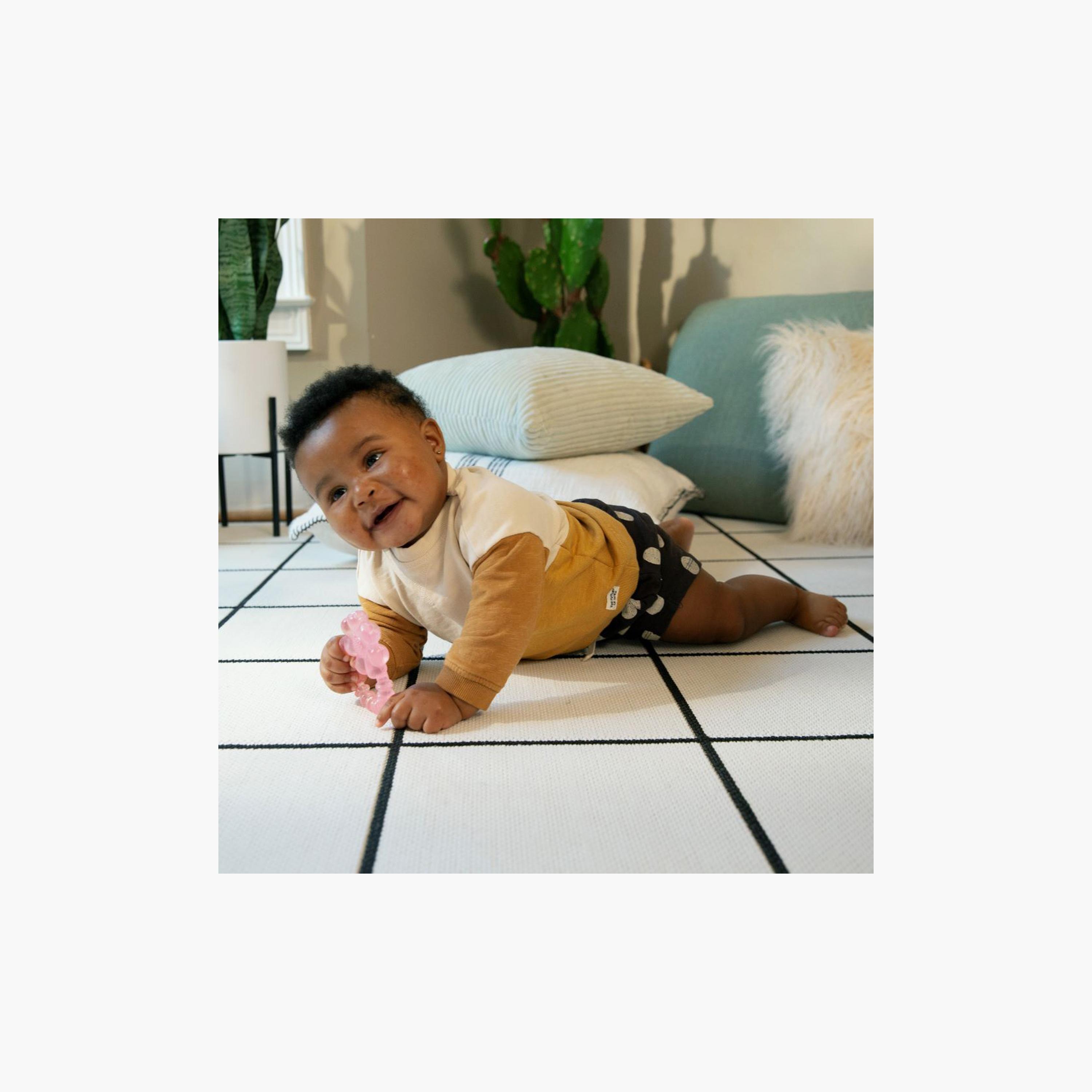 Water-filled design can be chilled for enhanced relief, providing extra comfort for teething babies.