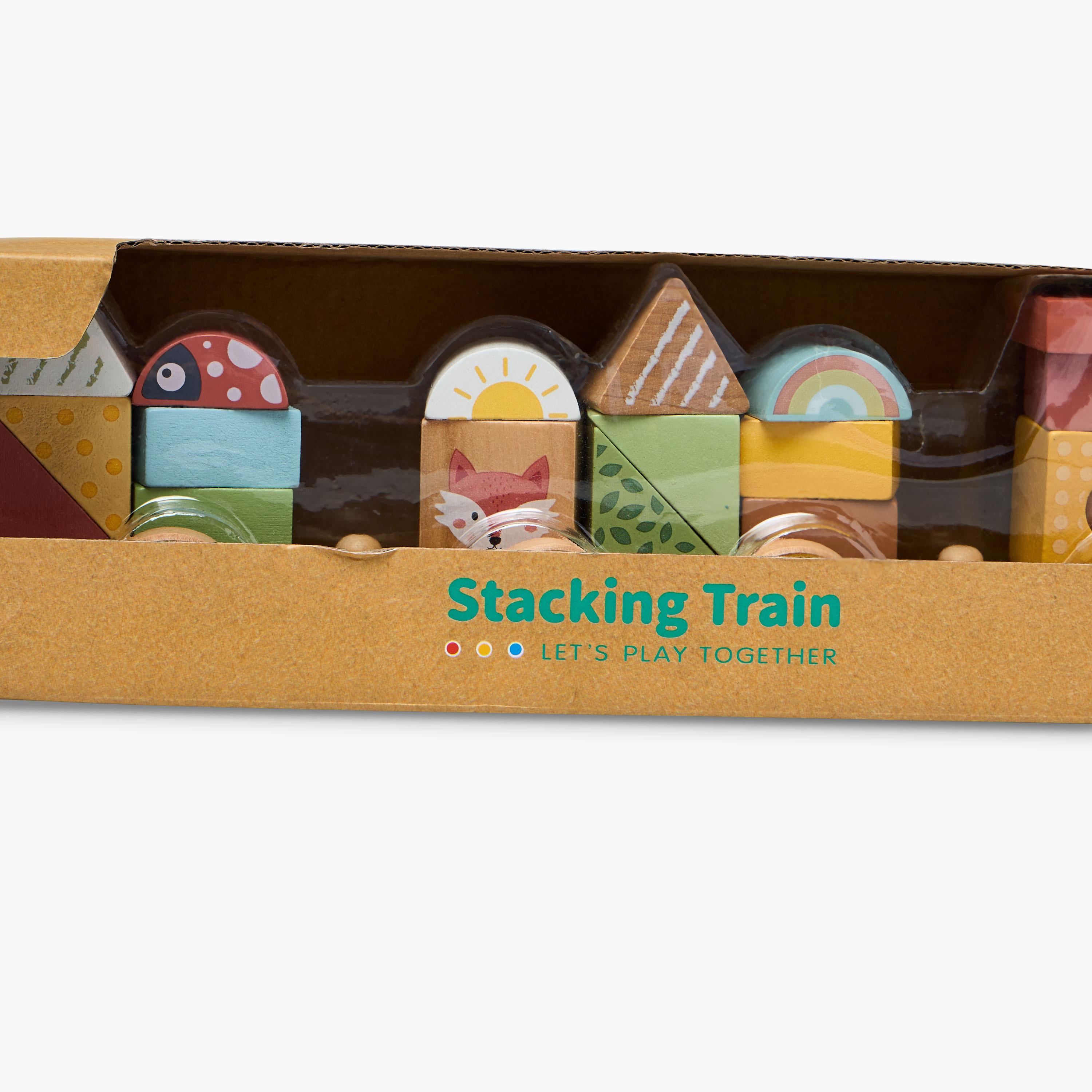 Each train car typically has holes or grooves where children can fit different shapes, such as blocks or rings.