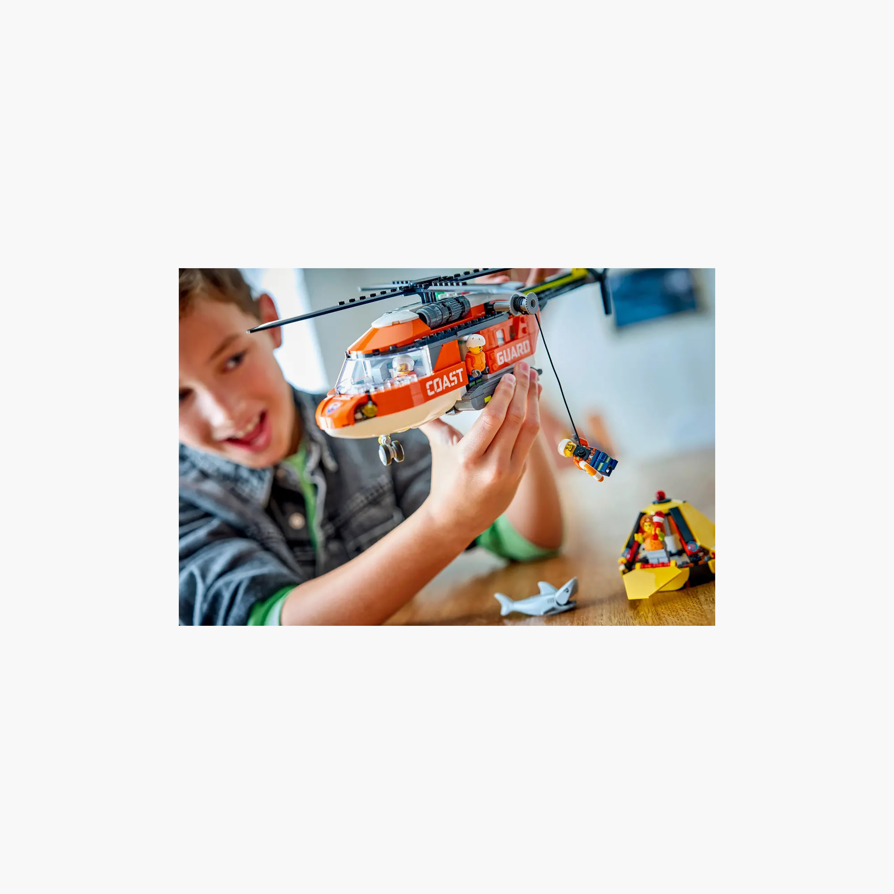 This LEGO City Coast Guard Helicopter toy building set (60503) is packed with authentic details for fans of pretend play and emergency vehicle toys. The impressive red helicopter model features spinnable rotors, sliding side doors, a fold-down rear ramp and a detailed cockpit and fuselage. Kids can lower a crew member with the helicopter winch and the set also includes a rescue capsule that folds open for access to its interior. Just add the pilot, civilian, 2 coast guards and shark for hours of imaginative play.