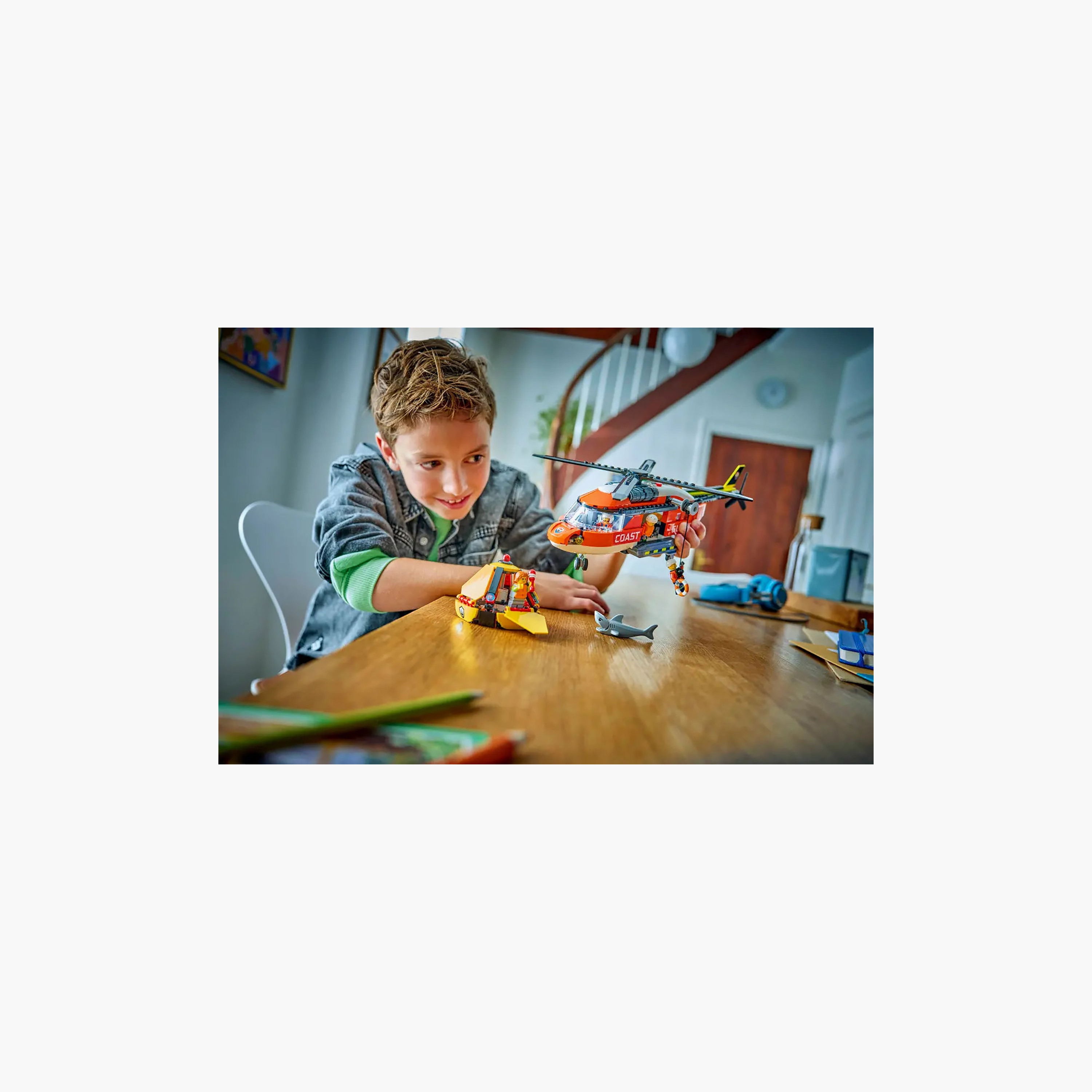 Kids can use the toy helicopter winch to lower the capsule or a rescue worker