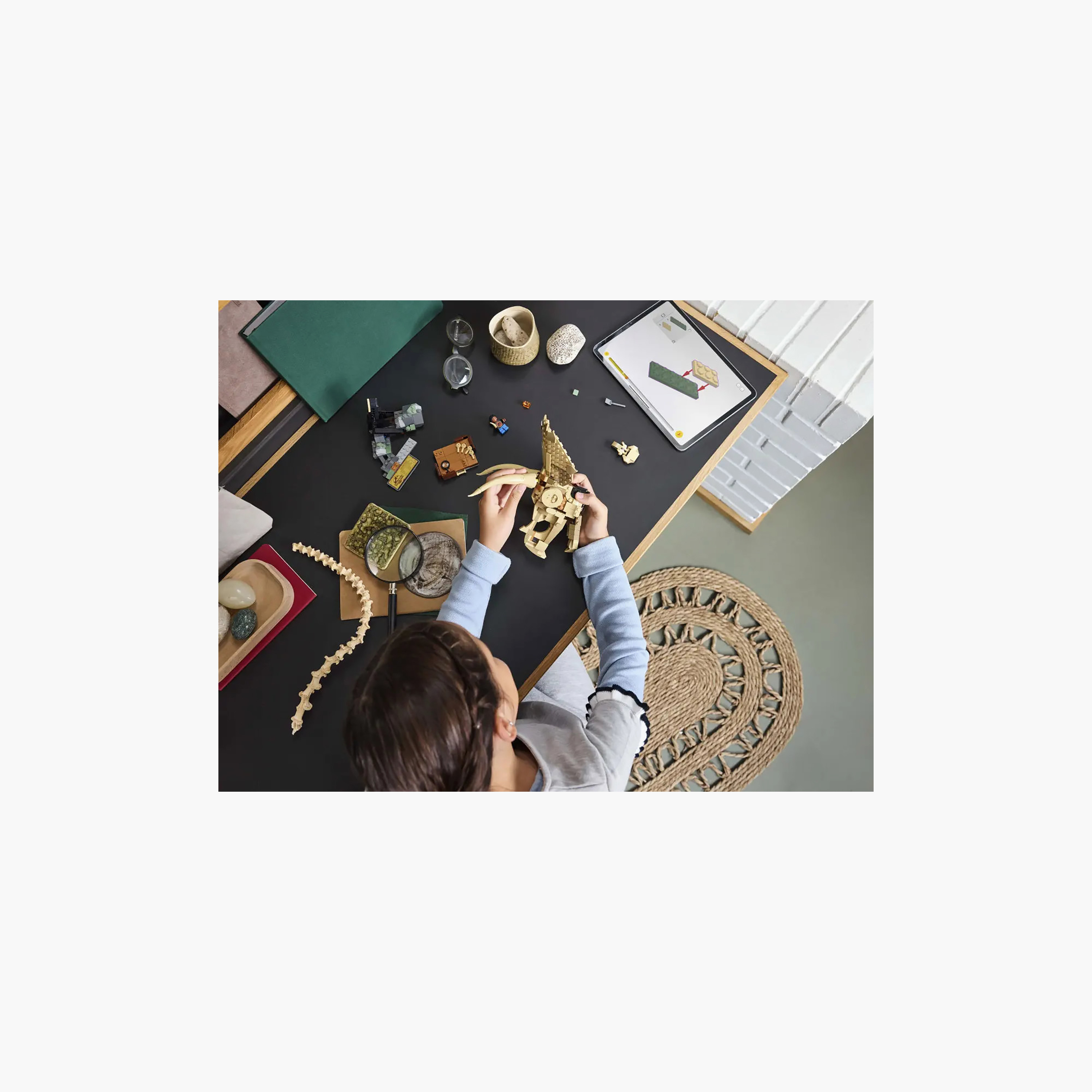 Young palaeontologists aged 9 and over can enjoy imaginative Jurassic World play by collecting dinosaur fossils with this Dinosaur Fossils: Triceratops Skull (76969) LEGO Jurassic World building kit. This model playset in the Dinosaur Fossils display series features a Triceratops skull with an opening jaw, a stand with a rock base, a dig site plate with mini-fossils and excavating tools, a LEGO minifigure, an information plaque and an ‘amber’ piece with an encased mosquito.