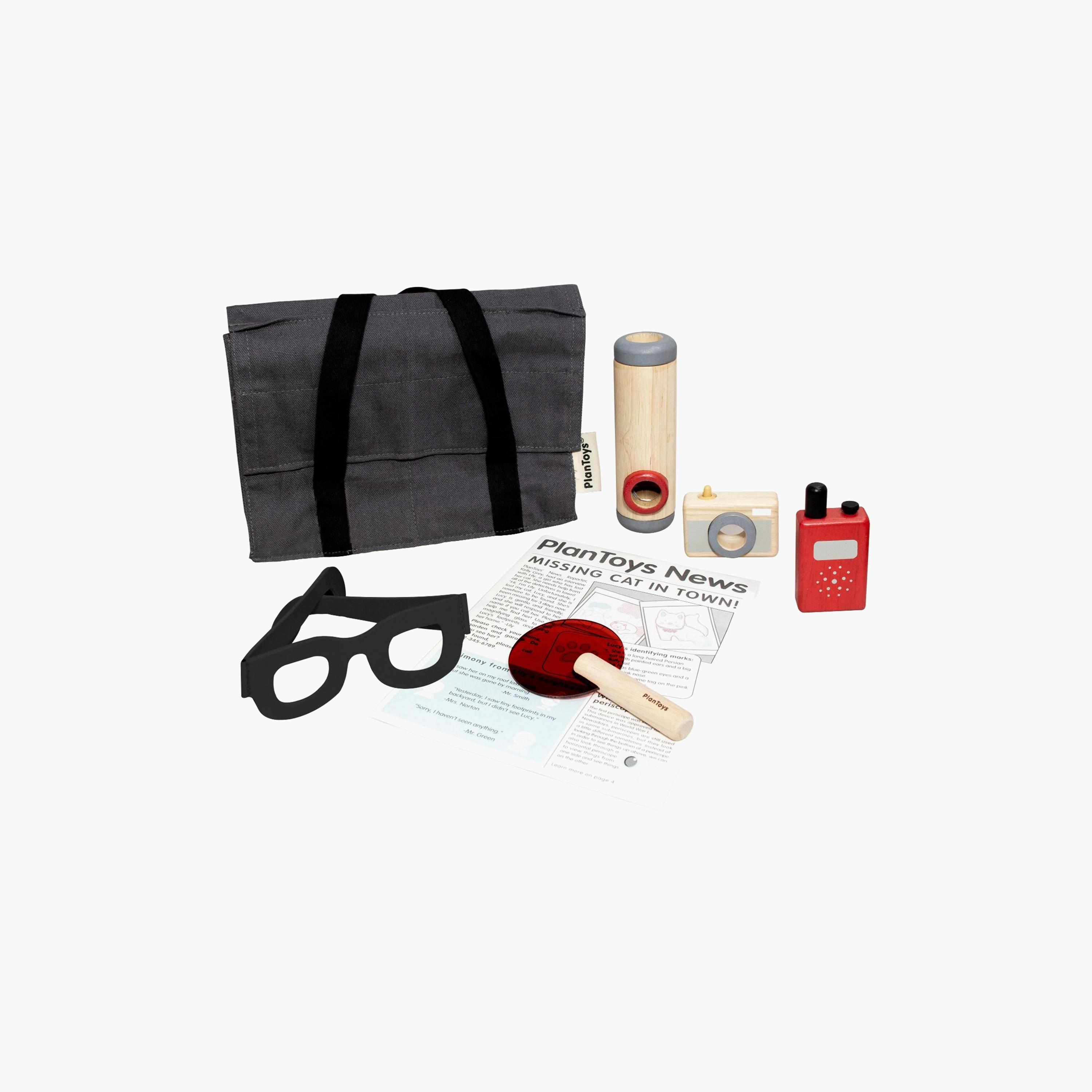 The Detective Set is a comprehensive kit that includes eye glasses, walkie-talkie, camera, a red lens, a periscope, and a bag, providing a complete role-play experience for young explorers.