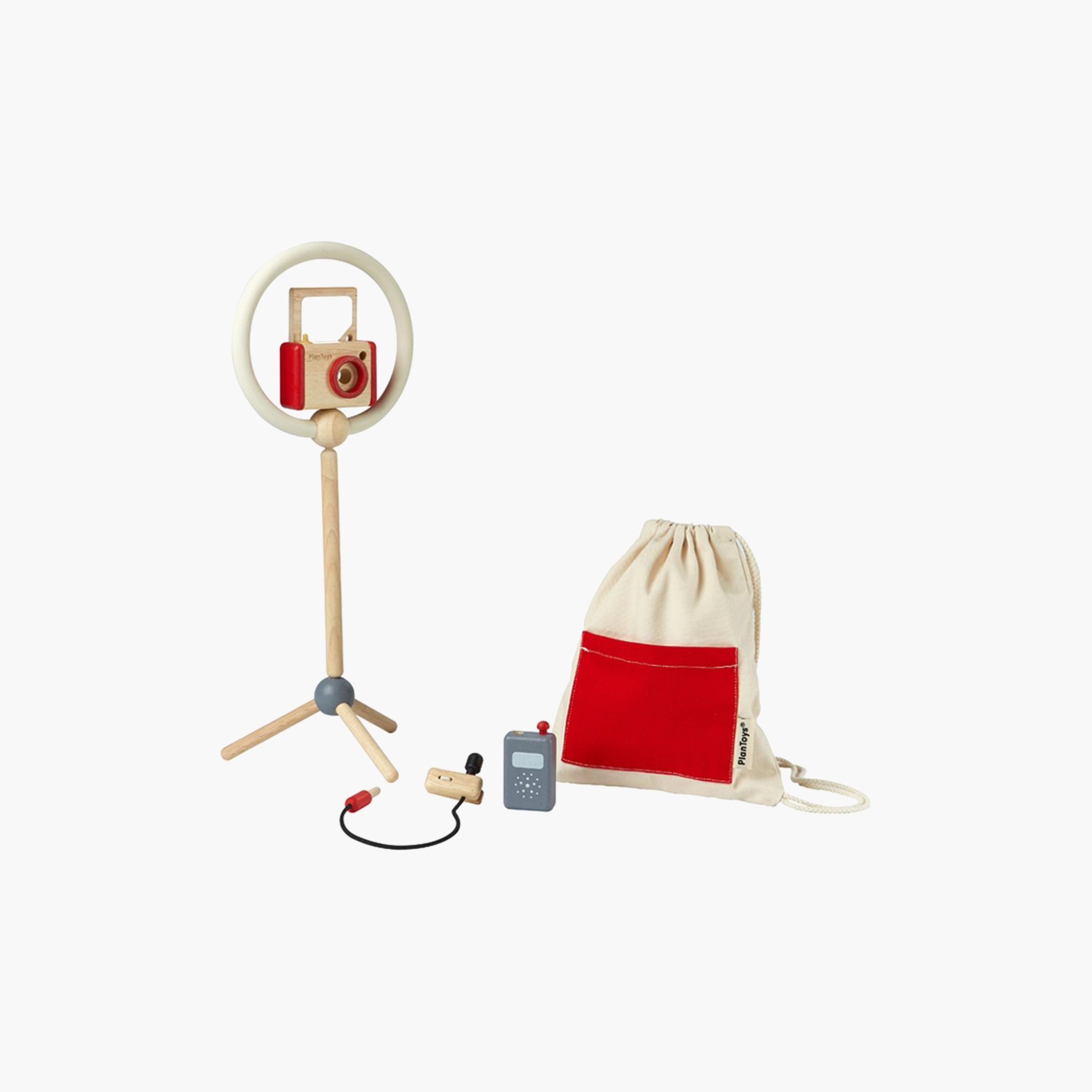 The Vlogger Kit is a comprehensive set including a play camera, a rubber ring light, a clip-on microphone with adaptor, and a selfie stick tripod, all designed to inspire creativity and enhance communication skills in children.