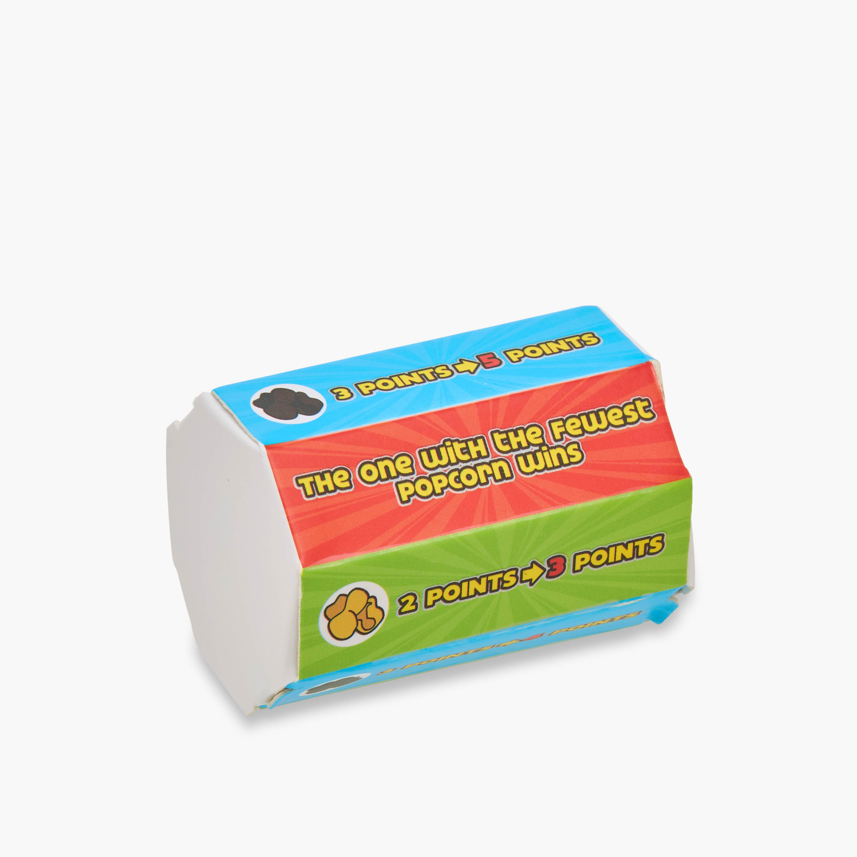 Simple Scoring Rules: Score points based on the color of the popcorn you catch – white for 1 point, yellow for 2 points, and brown for 3 points. The player with the highest score wins, but a roll of the dice can reverse the outcome for the player with the fewest points!