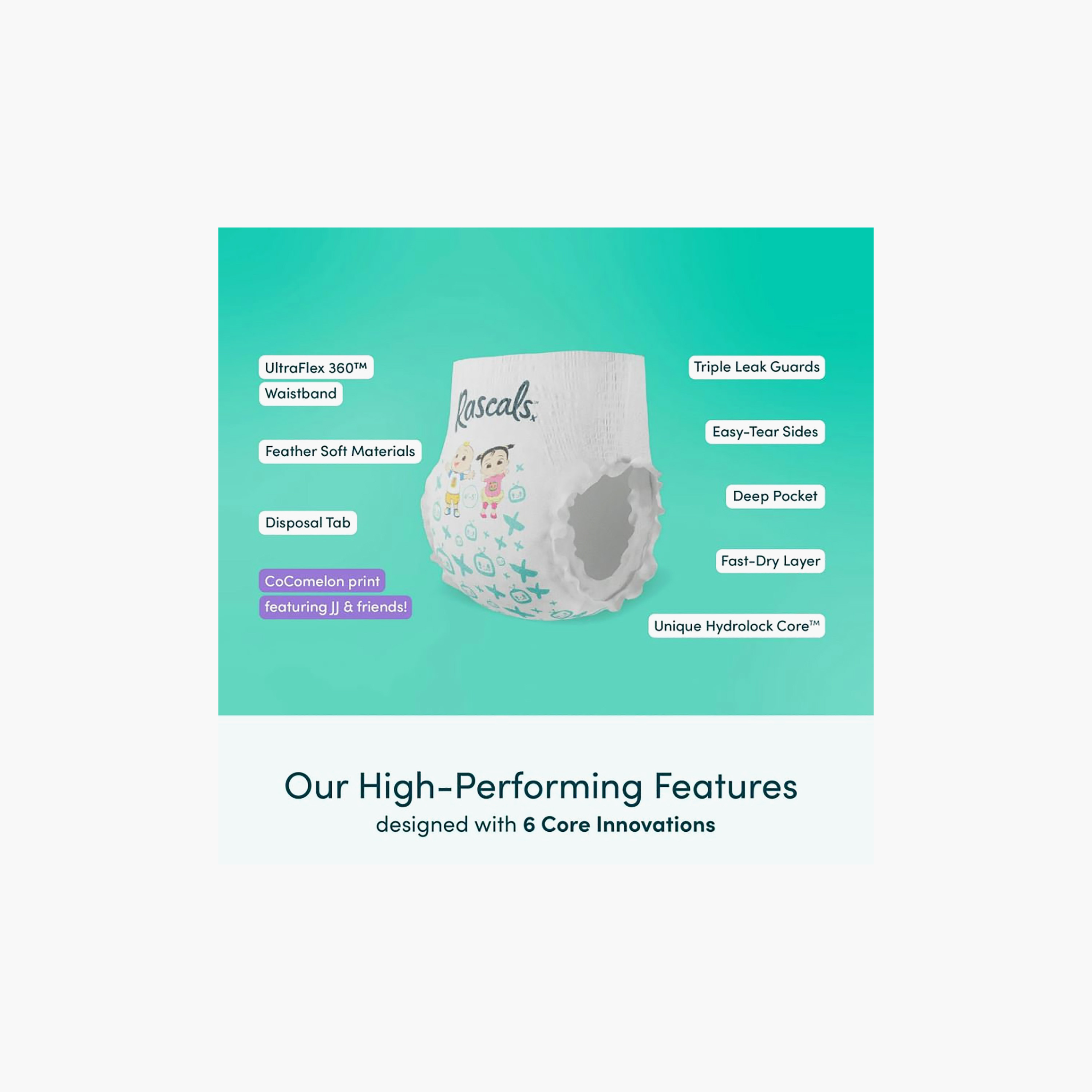 Introducing the Rascals 44-Piece CoComelon Edition Training Nappy Pants in Size 6, designed for toddlers weighing 15-20 kg. These limited edition training pants feature fun prints of JJ & friends from CoComelon, making potty training an exciting adventure. Engineered with 6 Core Innovations, they ensure fewer blowouts and less mess, reducing stress for parents. The UltraFlex 360 Waistband provides a comfortable fit with over 15 elastic pieces, while the Quick-Change Features, including easy-tear sides and a disposal tab, make changes swift and simple. The Easy On & Off Design mimics underwear, aiding the transition to potty training. Crafted with AirSpun Softness, these pants are feather-soft and gentle on sensitive skin. The Unique Hydrolock Core offers up to 12 hours of leak protection, holding up to 25x its weight. Dermatologist tested and OEKO-Tex certified, they are free from harmful substances, ensuring safety for your child.