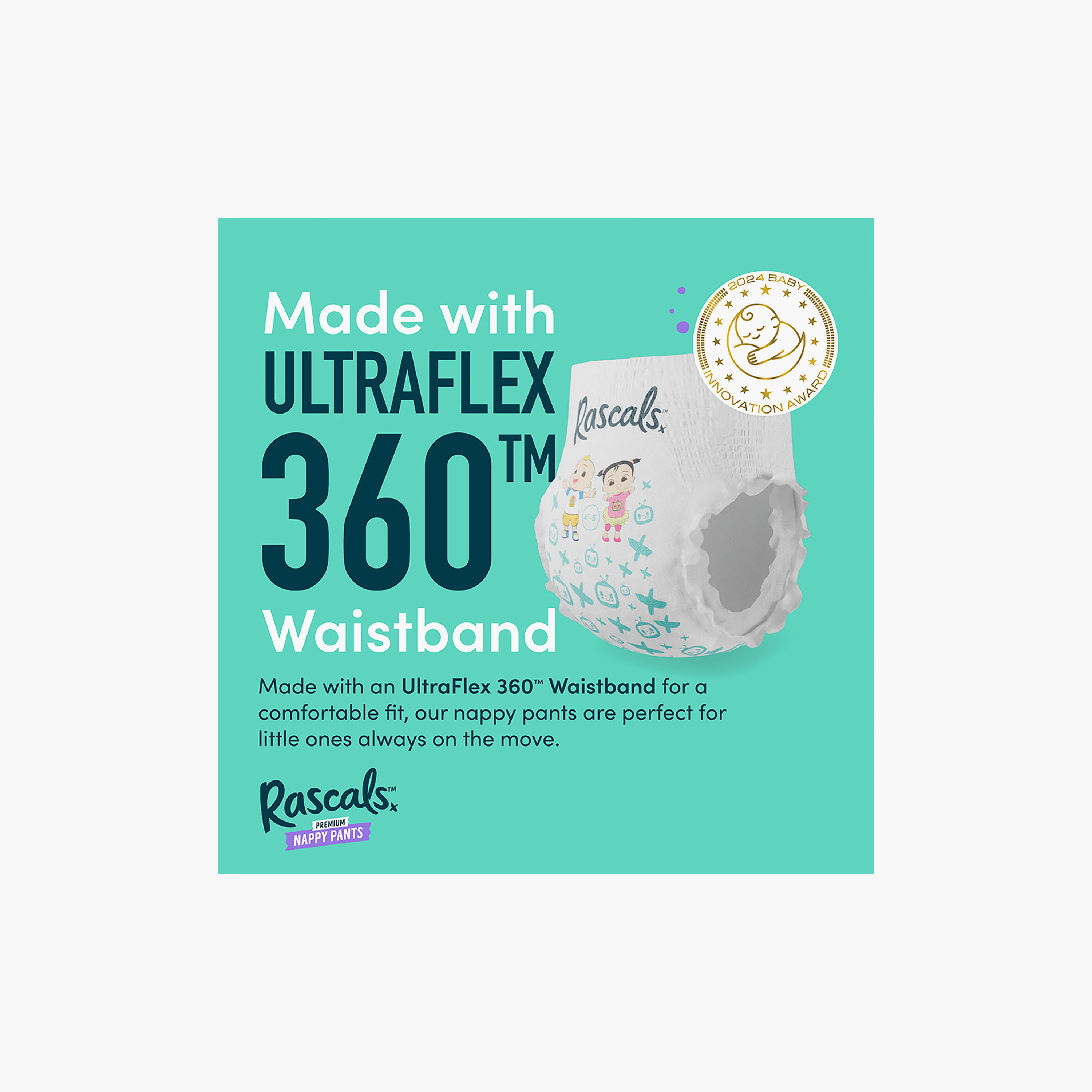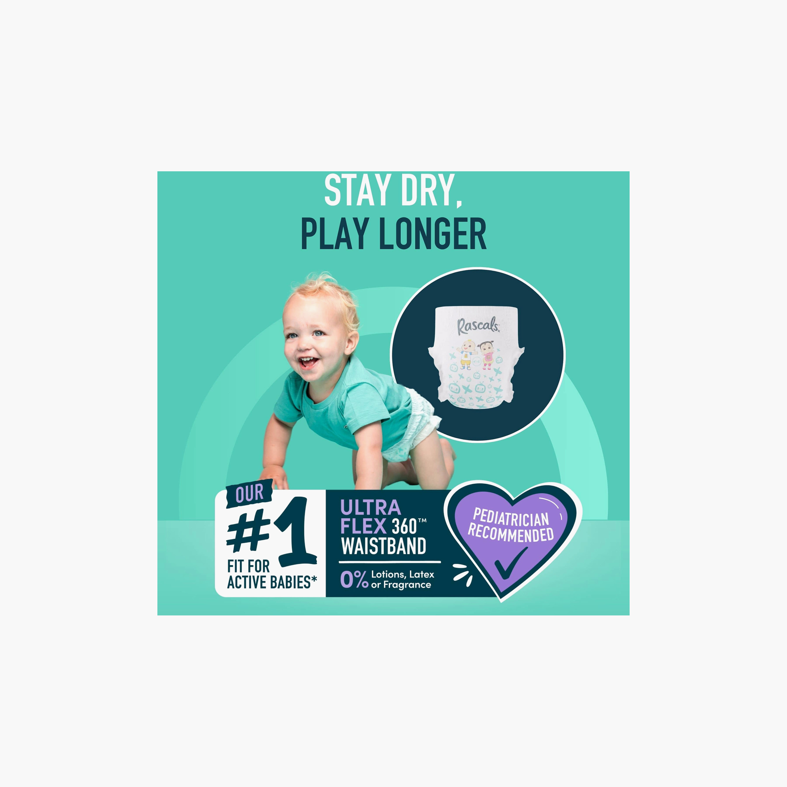 UltraFlex 360 Waistband: With 15+ pieces of elastic, our UltraFlex 360 Waistband offers our most comfortable fit for active babies.