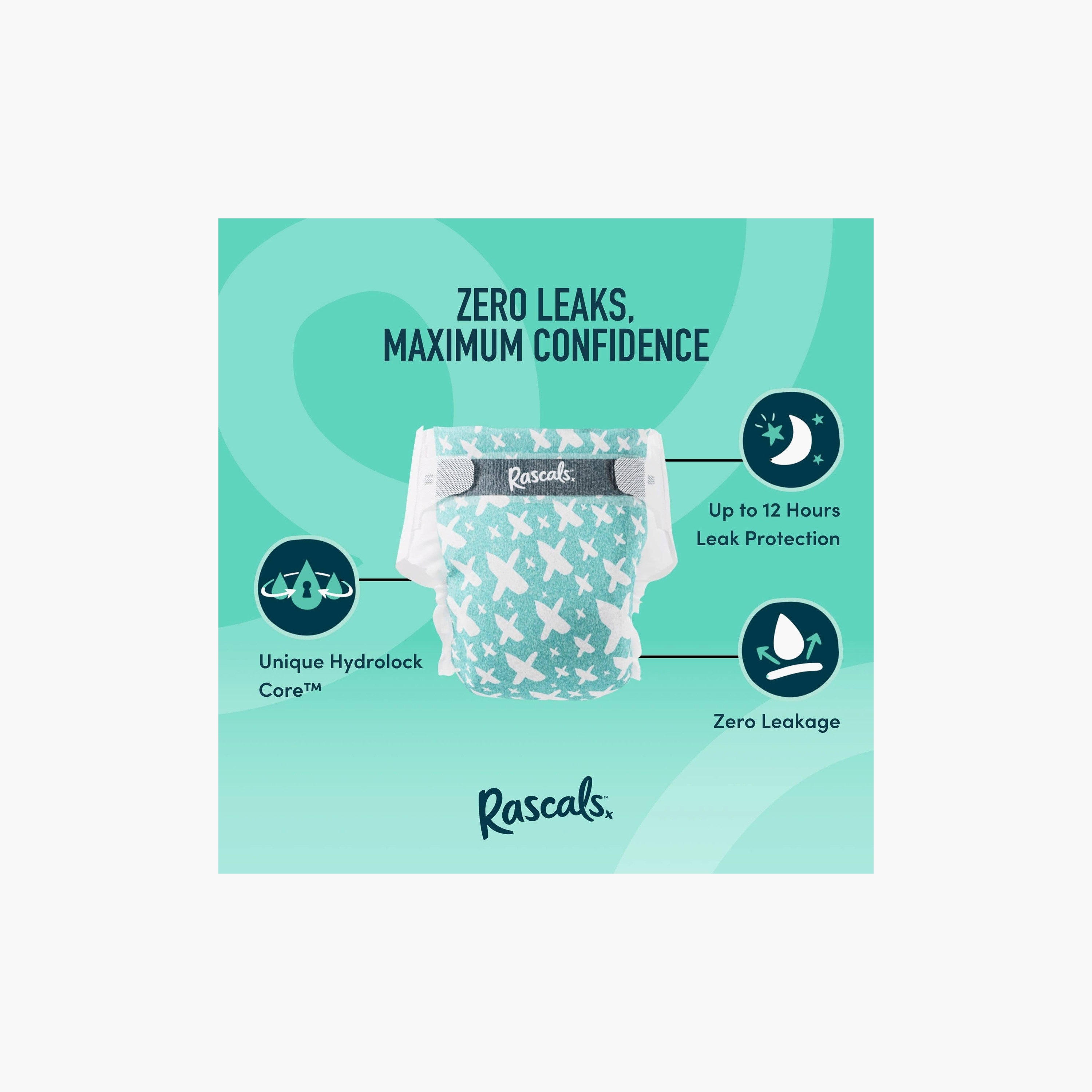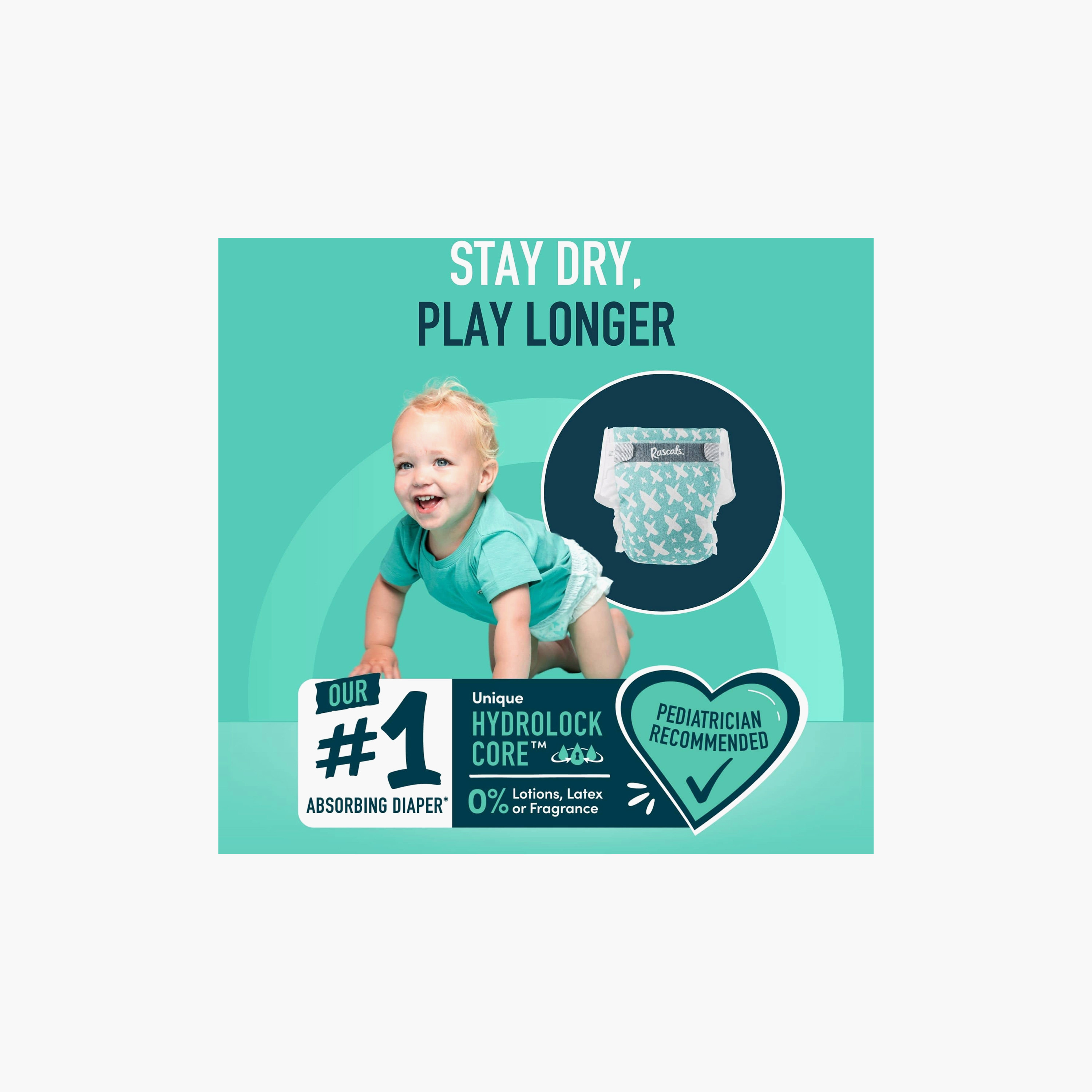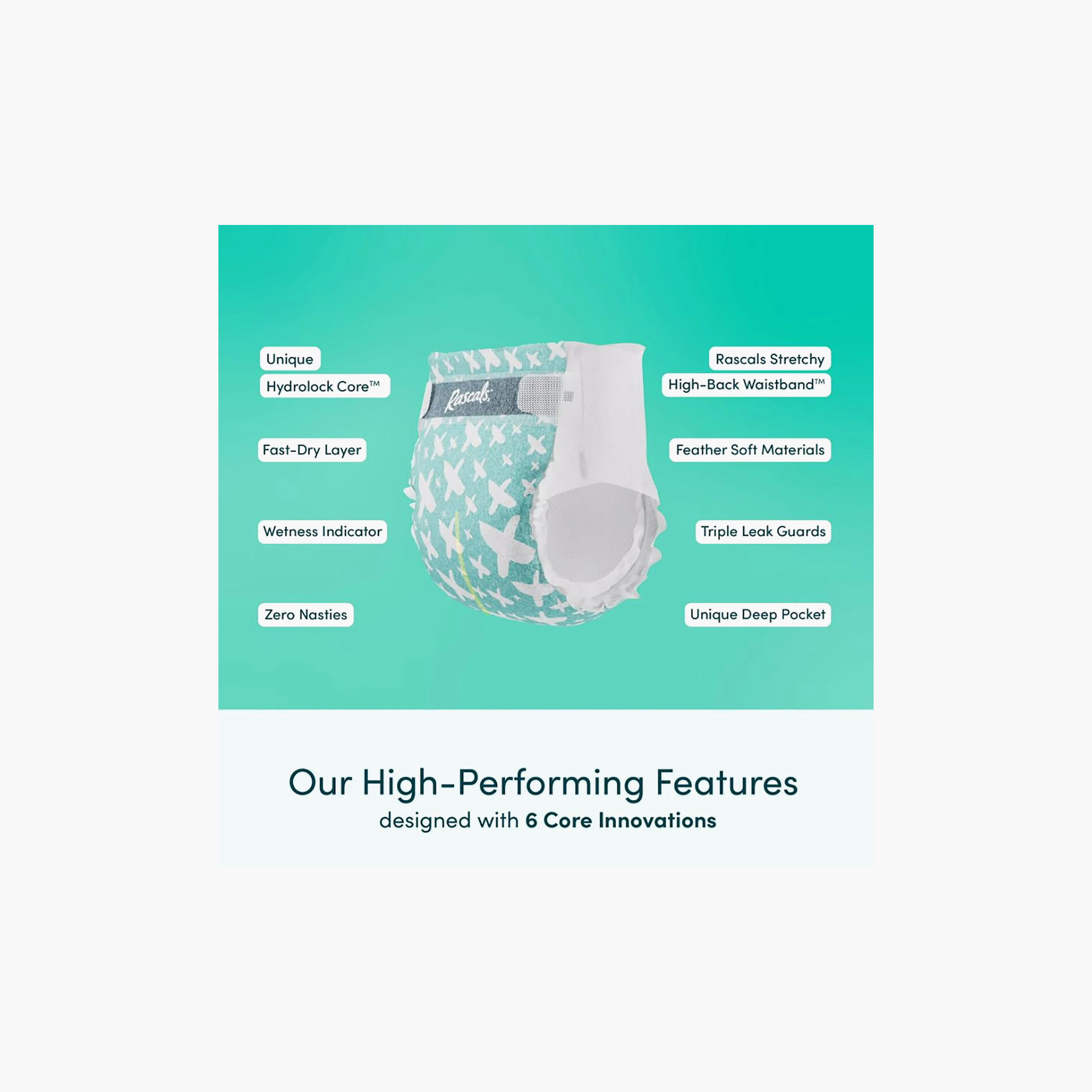 Introducing Rascals 54-Piece Premium Baby Diapers, Size 7, designed for little ones weighing 17 kg and above. Engineered with 6 Core Innovations, these diapers offer unparalleled performance and comfort. The unique Hydrolock Core provides up to 12 hours of advanced leak protection, holding up to 25x its weight in liquid, ensuring fewer blowouts and less stress. The Rascals Stretchy High-Back Waistband offers up to 2.6x stretch for a snug fit, while AirSpun Softness ensures a feather-soft feel. With triple leak guards, a fast-dry layer, and a wetness indicator, these diapers are OEKO-Tex certified, free from harmful substances, and perfect for sensitive skin. Trusted by parents globally, Rascals delivers award-winning quality at everyday prices, making them the ideal choice for modern parents.