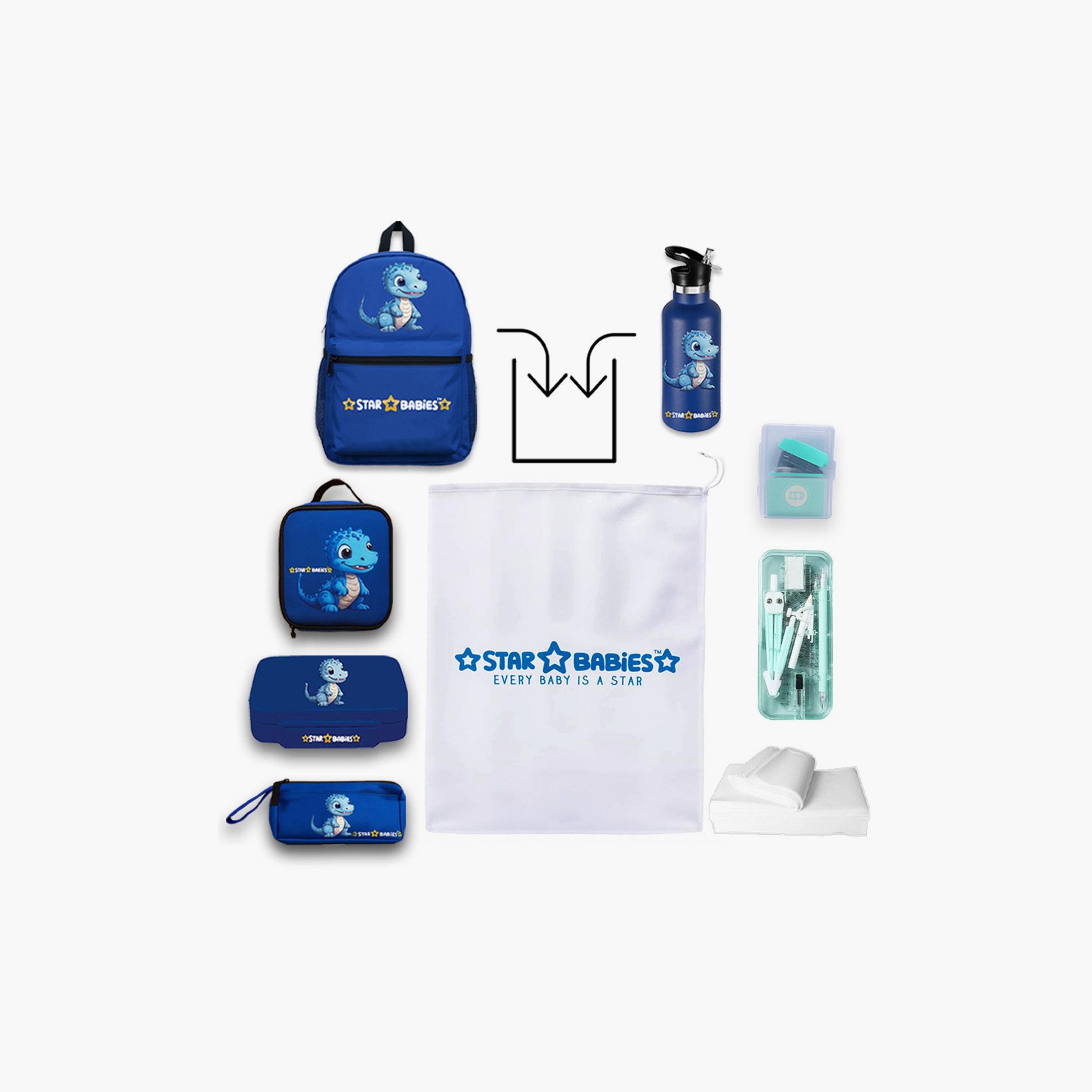 Embark on a learning adventure with the Star Babies 4-Piece 16" Backpack Set - Dinosaurs. This vibrant set includes a 16-inch backpack adorned with playful dinosaur designs, a matching pencil case, a spacious insulated lunch bag, and a 4-compartment lunch box to keep meals organized. Stay hydrated with the 500ml leakproof water bottle. Plus, enjoy free gifts: a pack of 10 disposable towels, a geometry set, and a mini stapler set. Perfect for young explorers, this set combines functionality and fun, ensuring your child is ready for every school day.