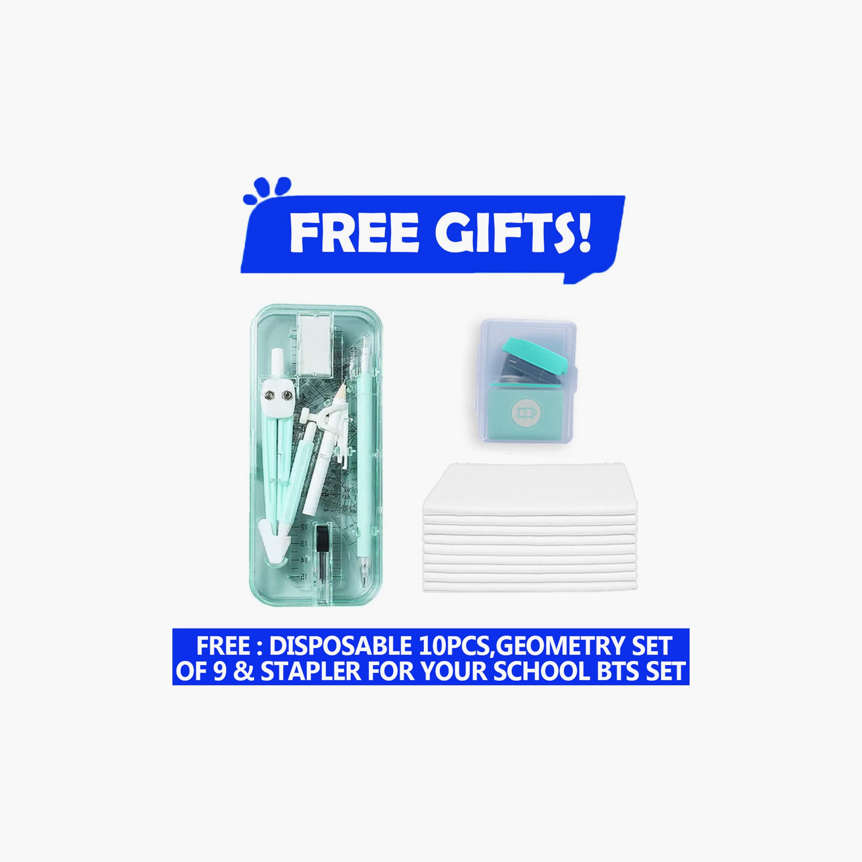 1 x Backpack, 1 x Lunch Bag, 1 x Water Bottle, 1 x Pencil Case, 1 x Lunch Box, 10 x Disposable Towels, 1 x Stapler, 1 x Geometry Set