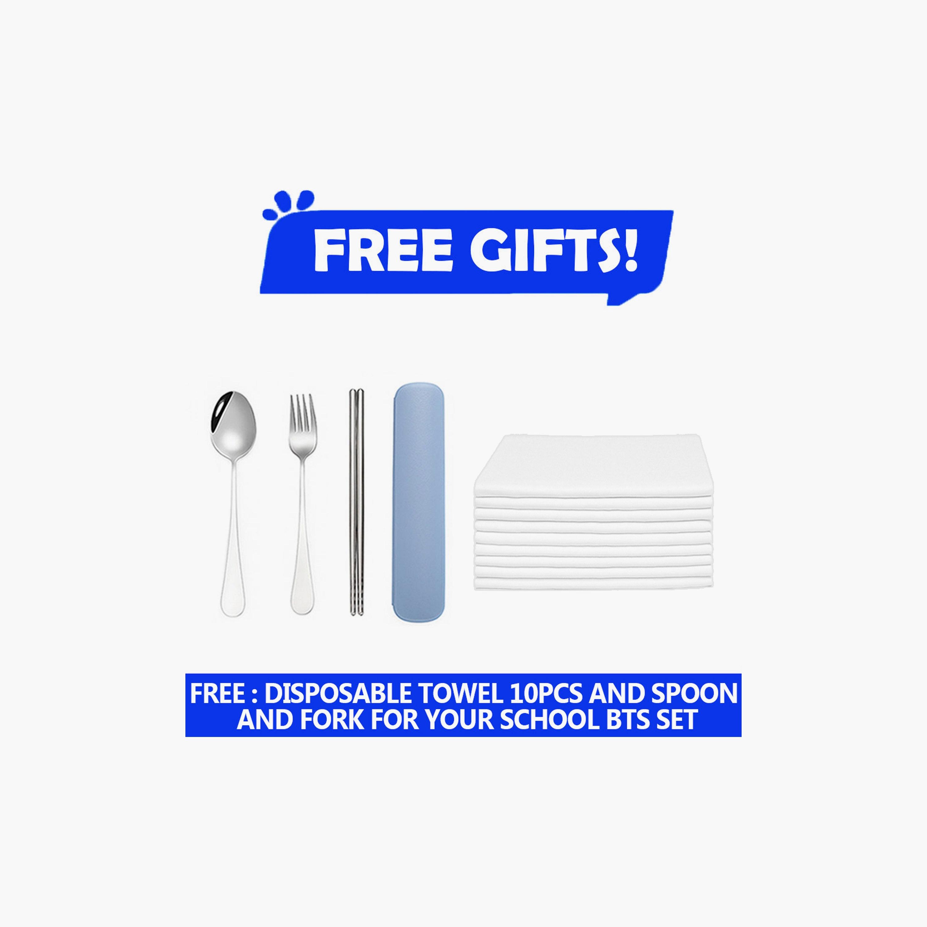 1 x Water Bottle, 1 x Lunch Box, 1 x Spoon, 1 x Fork, 1 x Case, 2 x Chopsticks, 10 x Disposable Towels