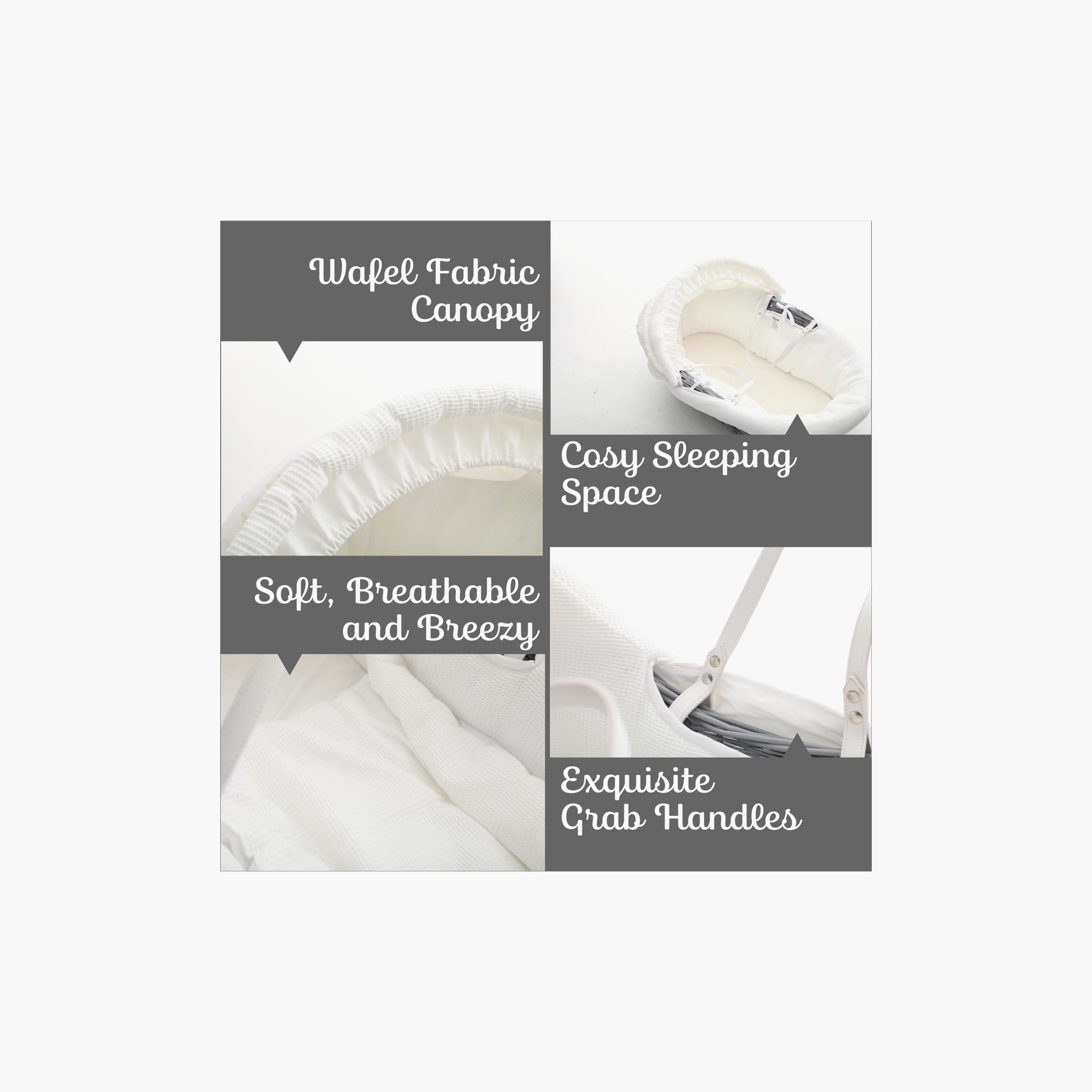 Wicker Moses Basket is gently woven. Lightweight & sturdy willow wicker comes with Handles for easy portability of the Moses Basket only. Designed for Newborn's delicate skin and comes with super soft & breathable Waffle Beddings made of 100% Cotton Fabric & 100% Polyester Fillings.