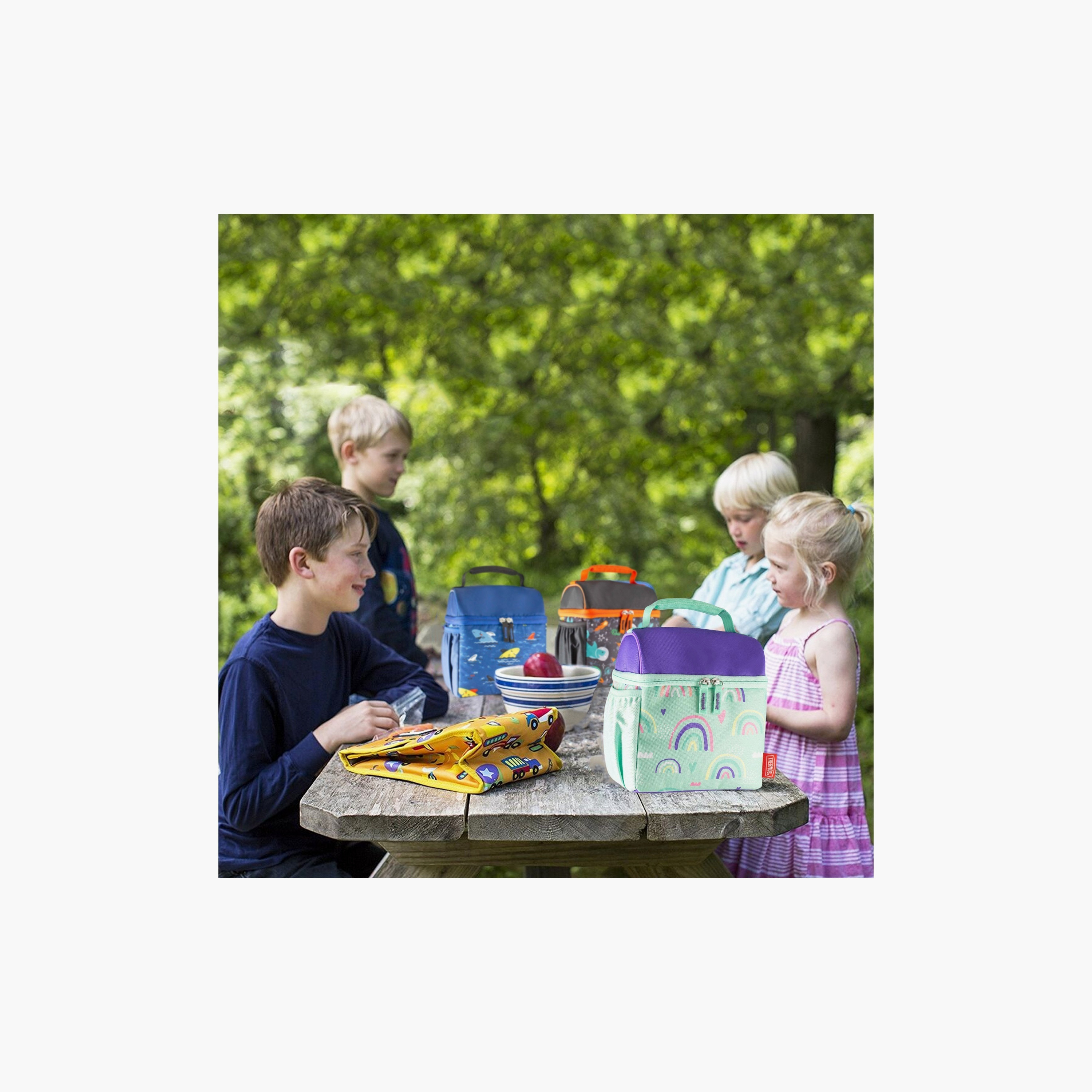 Stylish rainbow print design with a convenient pop-top opening for easy access to your meals.