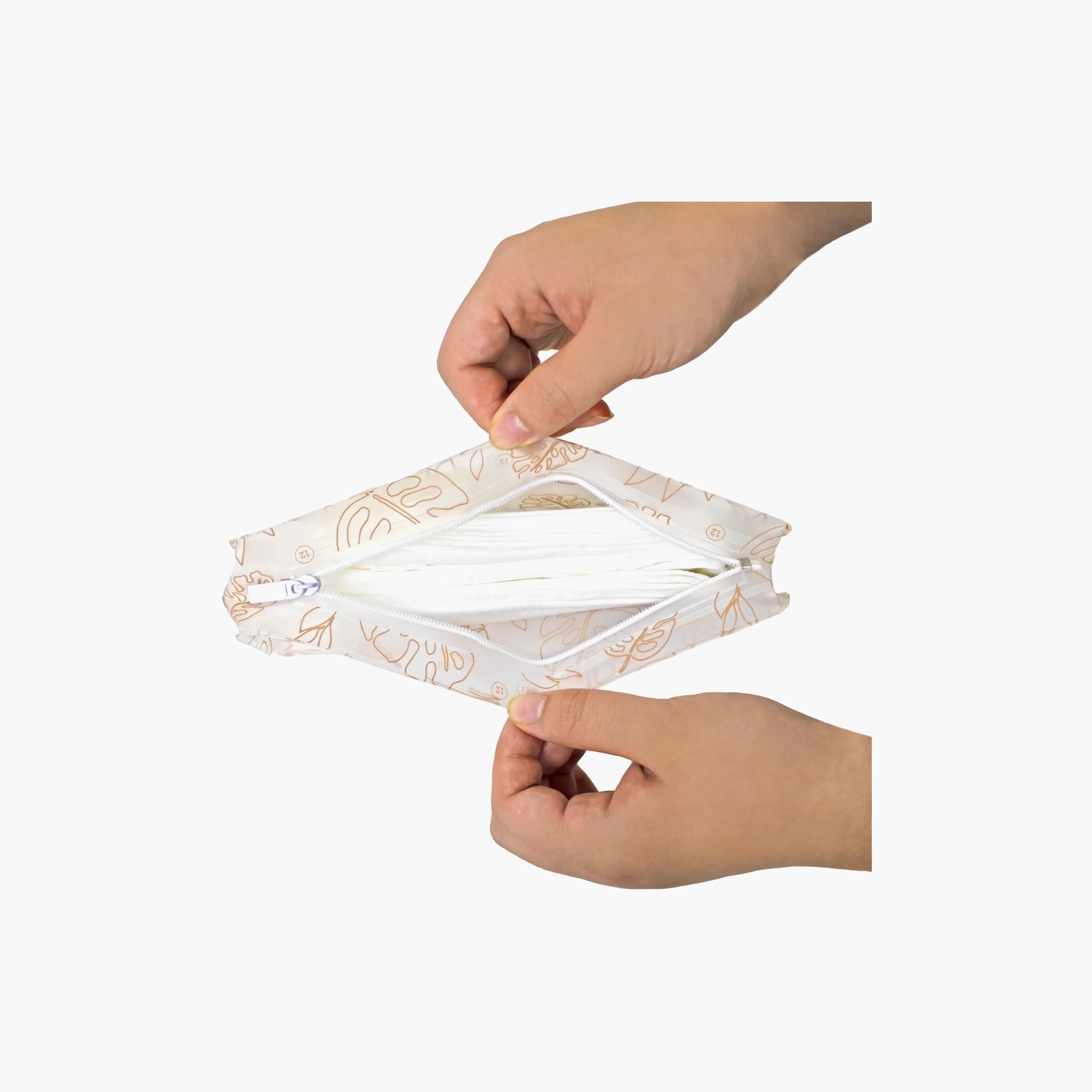 The TWELVElittle Reusable Wet Wipes Frosted Pouch is the perfect solution for keeping your wipes organized and accessible. Simply slide the top opening to insert the wipes, and slide it back to close. It fits perfectly inside the Peek-A-Boo collection frontflap pocket or front pockets of various TWELVElittle bags. This pouch is also handy in the car for various spills and cleaning of surfaces, baby's hands and face.