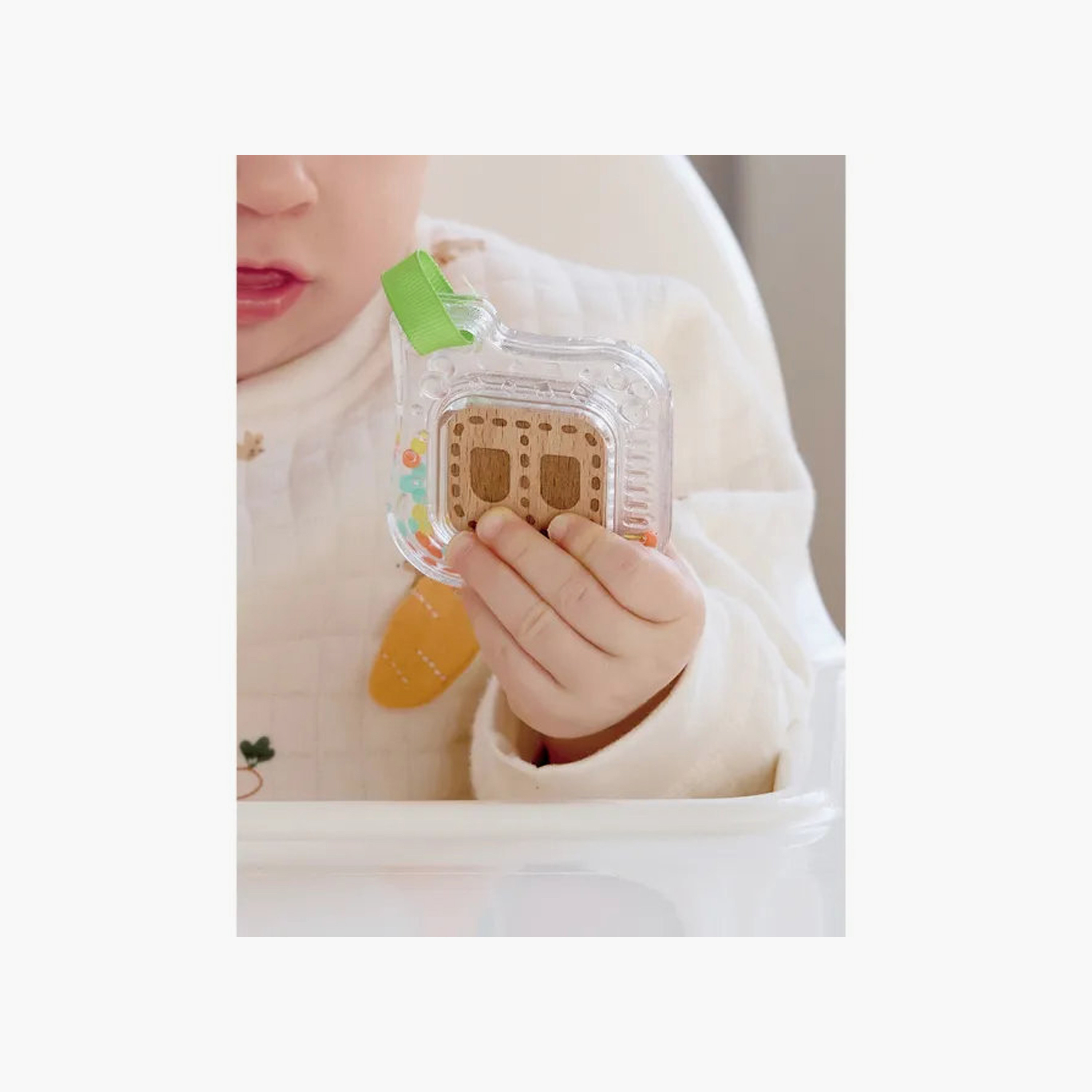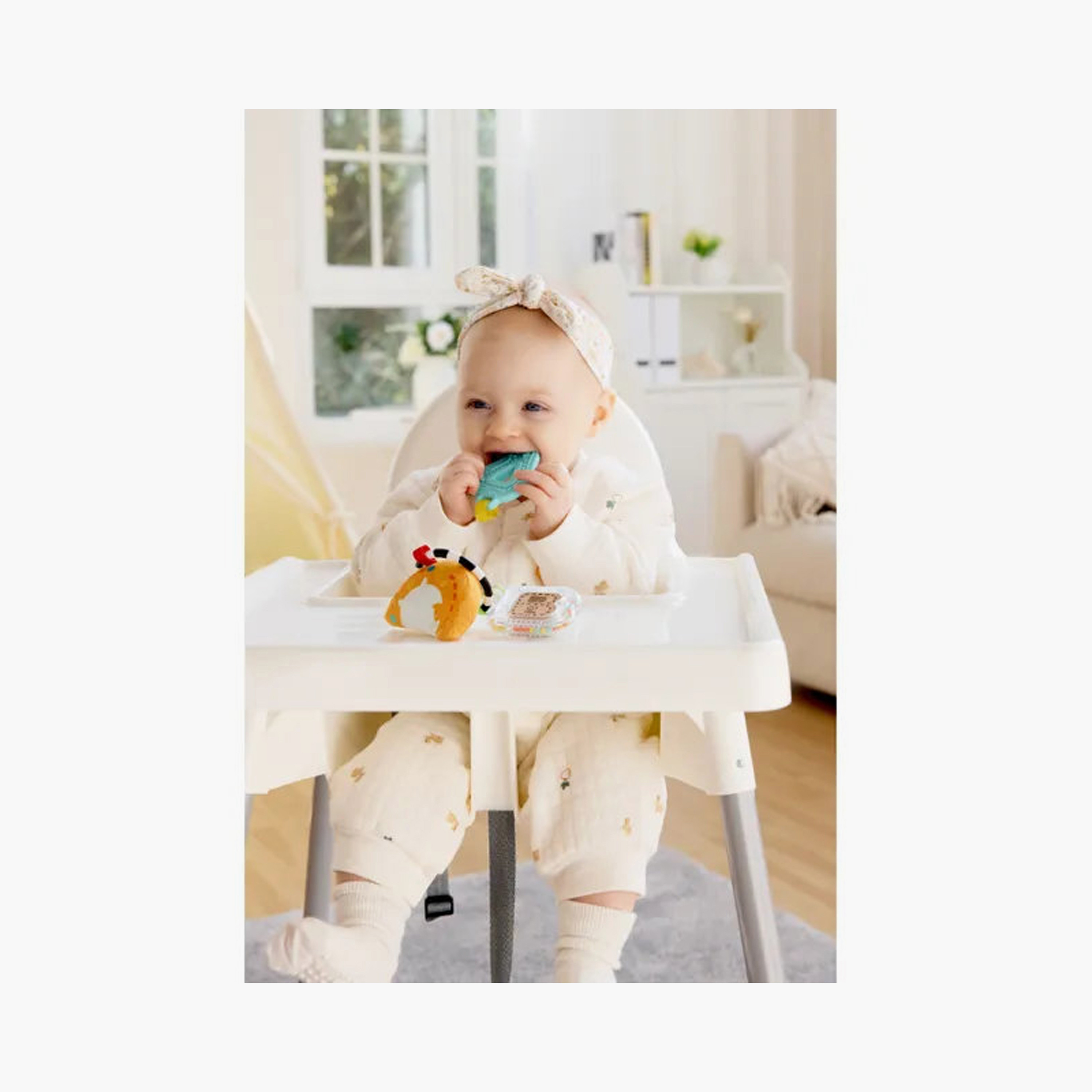 مجموعة متعددة القطع تحتوي على عضاضة، وخشخيشة، ولعبة قطيفة متصلة بحلقة باللونين الأسود والأبيض لسهولة السفر والتعليق.