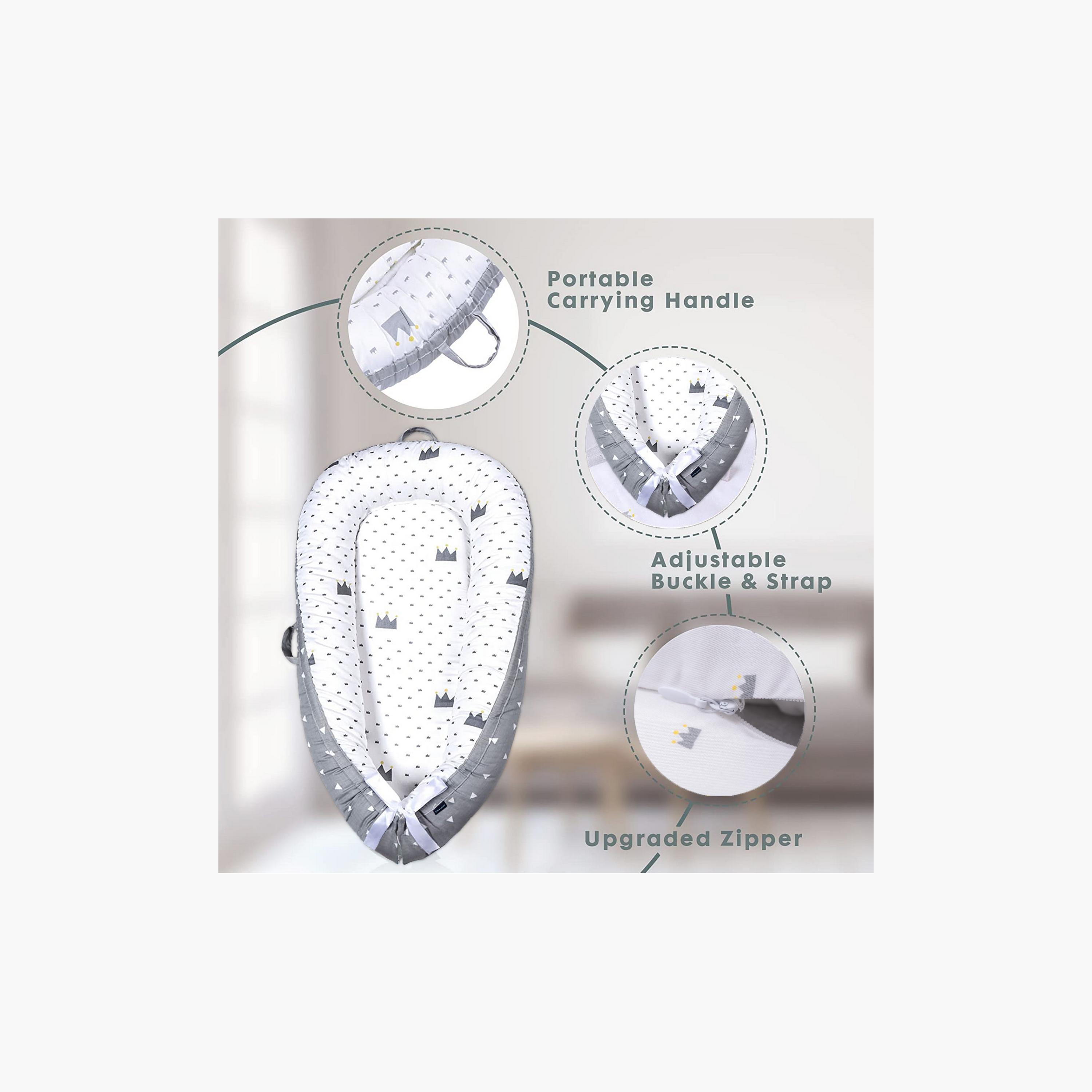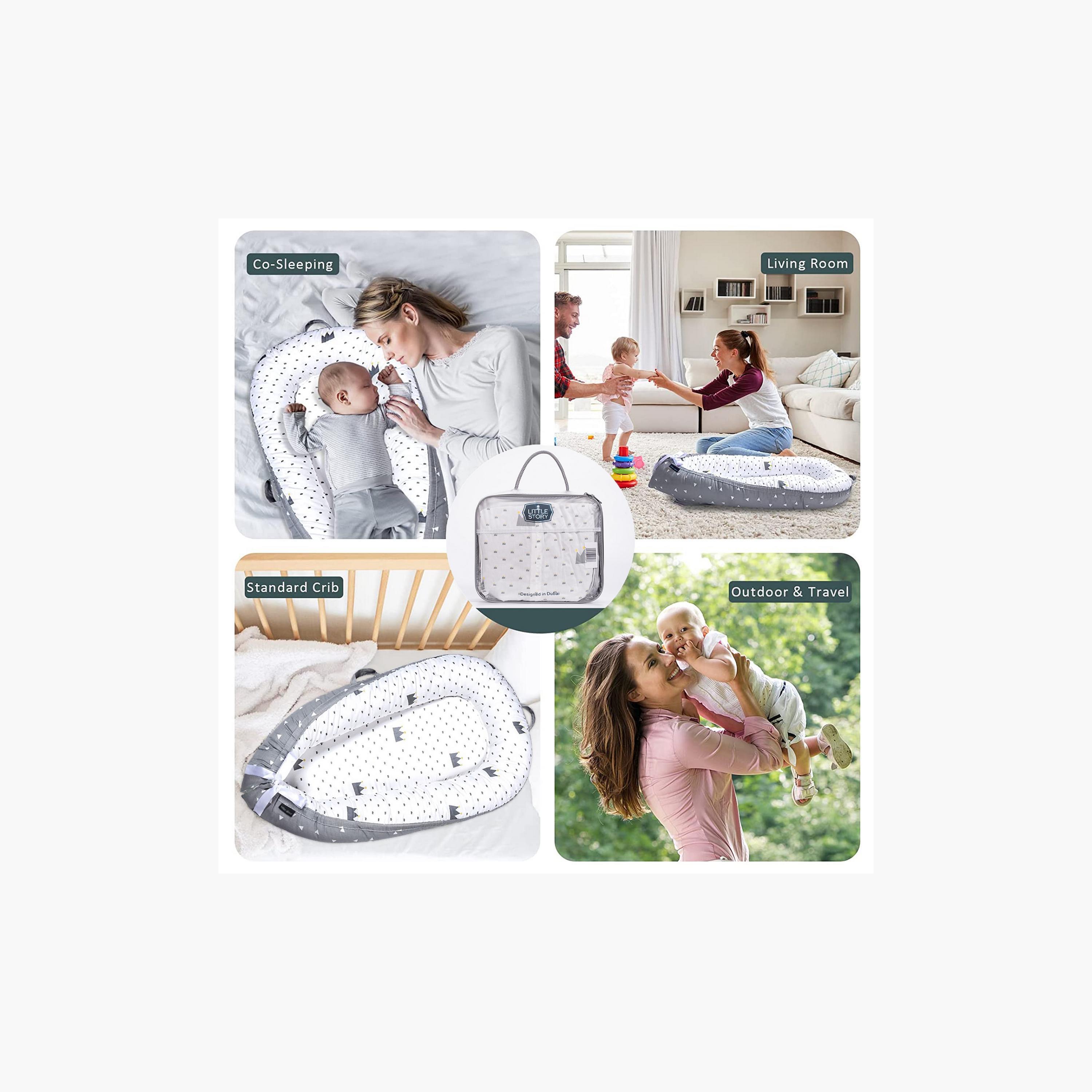 مصمم بسحاب سهل الاستخدام ولا يسبب أي عقبات أو كسر مثل غيره من كراسي الأطفال. سهل الغسيل، كما أن أغطية السرير والحلقة الخارجية والوسادة كلها قابلة للفصل., يبلغ طول عش النوم للأطفال 90 سم وعرضه 50 سم. أضفنا أيضًا وسادة إضافية للقاعدة مما يجعلها 4 سم للحصول على دعم مثالي. يمكن استخدامه كسرير سفر للطفل على الأرضيات الصلبة أو أسرة الفنادق. يُعد كرسي استرخاء مثالي ومكان للراحة ومساعد في وقت البطن ومفرش للسفر، وهو من الضروريات لحديثي الولادة. كما تم تصميم الغطاء المسامي لتتمكني من غسله., غطاء من القماش القطني بنسبة 100 في المائة للأنبوب والوسادة وحشو الألياف، مع حشوة جانبية إضافية، مرتبة 4 سم تأتي مع سحاب مخفي. يأتي بنمطين جانبين مختلفين بحيث يمكنك التبديل بين النموذجين من الداخل والخارج. قابل للتعديل، ببساطة فكي السلك في نهاية المصدات لجعل الحجم أكبر. يمكن فتح نهايات المصدات بالكامل.