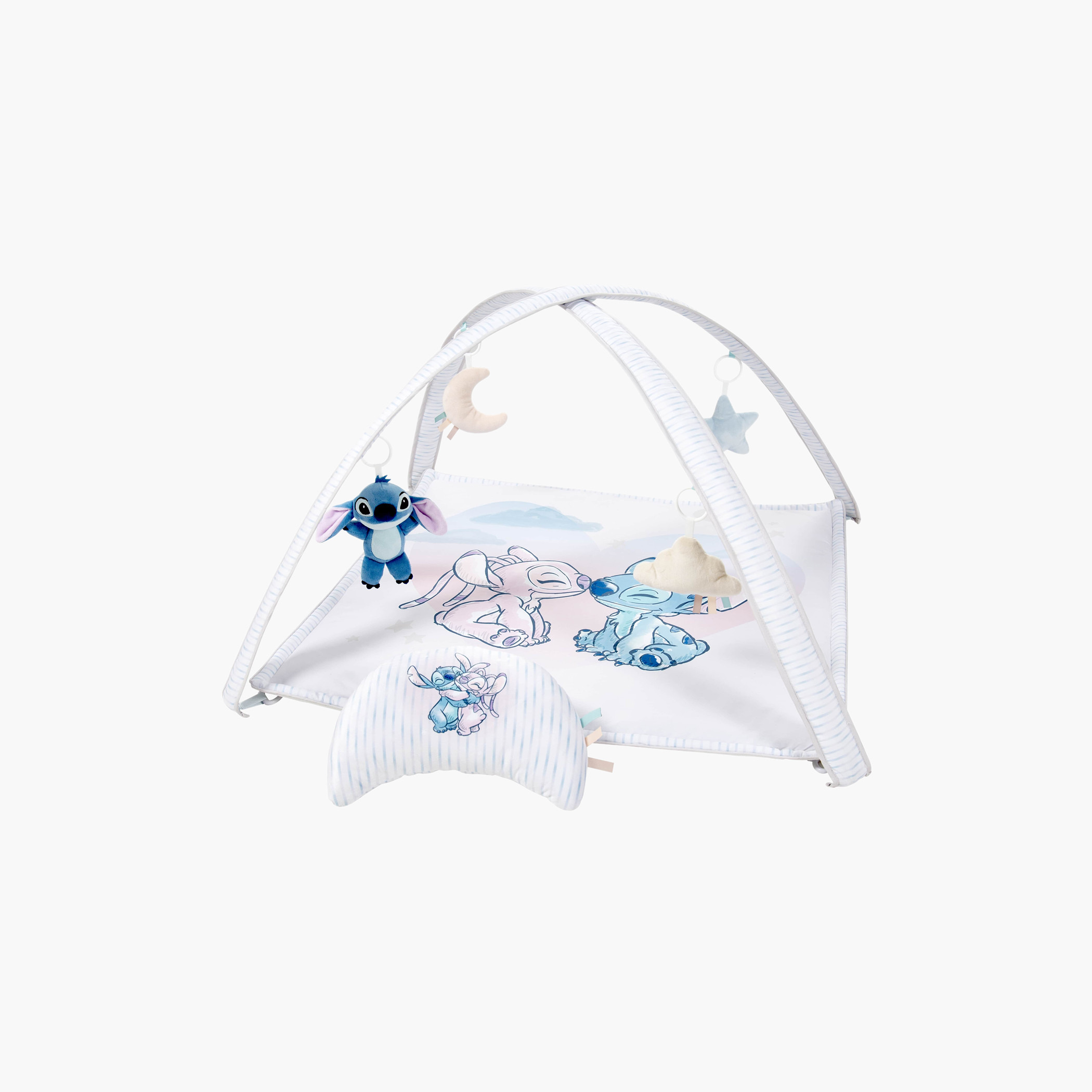 This is a vibrant and engaging activity mat designed for infants and toddlers. Featuring the beloved character Stitch from Disney's "Lilo & Stitch," this playgym offers a colorful and stimulating environment for your little one. It typically includes various interactive elements such as hanging toys, mirrors, and textured fabrics to encourage sensory exploration and motor skill development. The playgym is made from soft, baby-safe materials, ensuring a comfortable and safe playtime experience. It's a perfect choice for parents looking to combine fun and developmental benefits for their child.