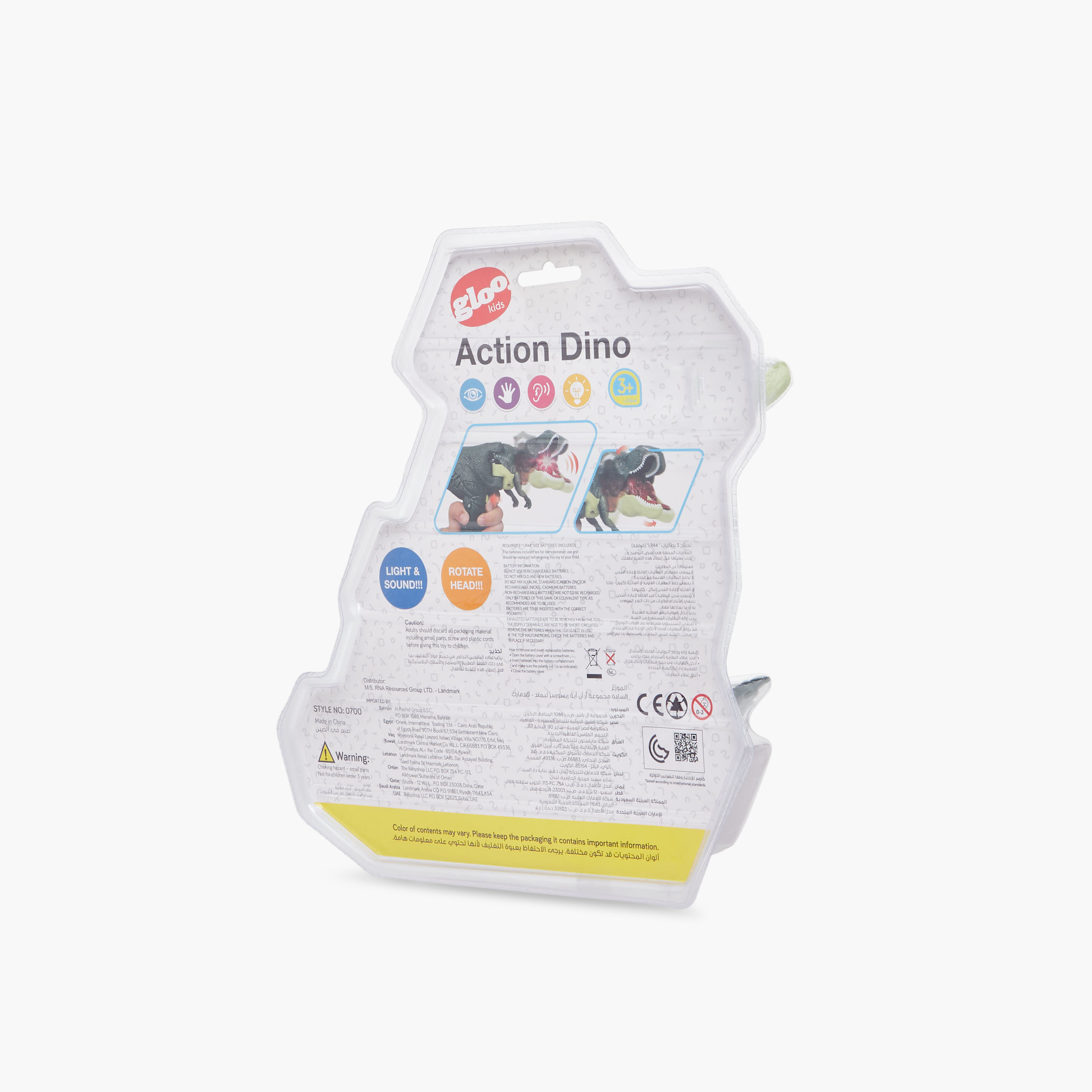 when play it .it with sounds and light . Dino head can rotate 180 degrees