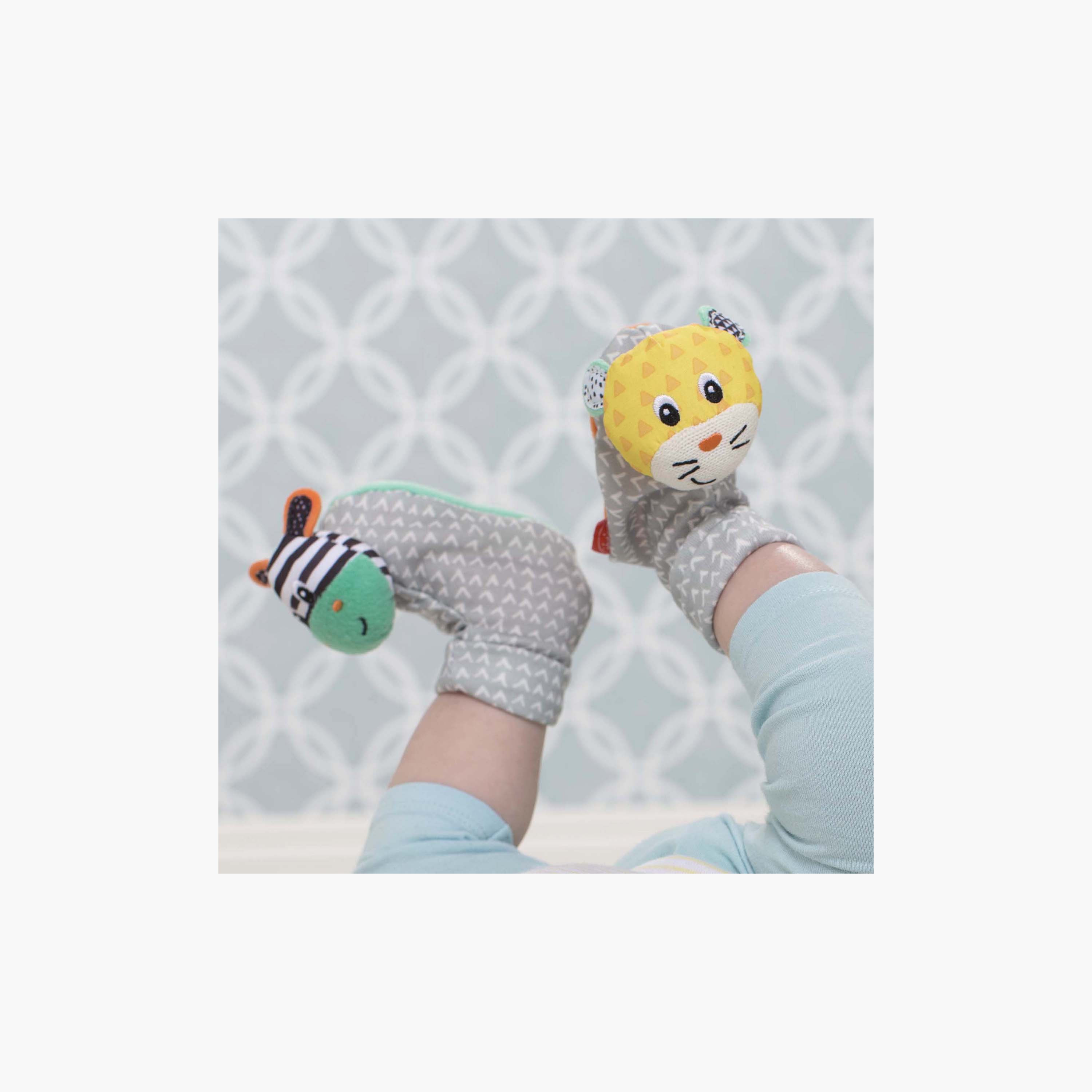 Infantino 2-Piece Zebra Tiger Foot Rattles are adorable plush foot toys designed to promote development. Easy to slip on, these fun friends encourage babies to shake, reach, and grab, enhancing hand-eye coordination. Perfect for active little ones, each set includes a zebra and tiger rattle, making playtime engaging and entertaining while supporting motor skills and movement.