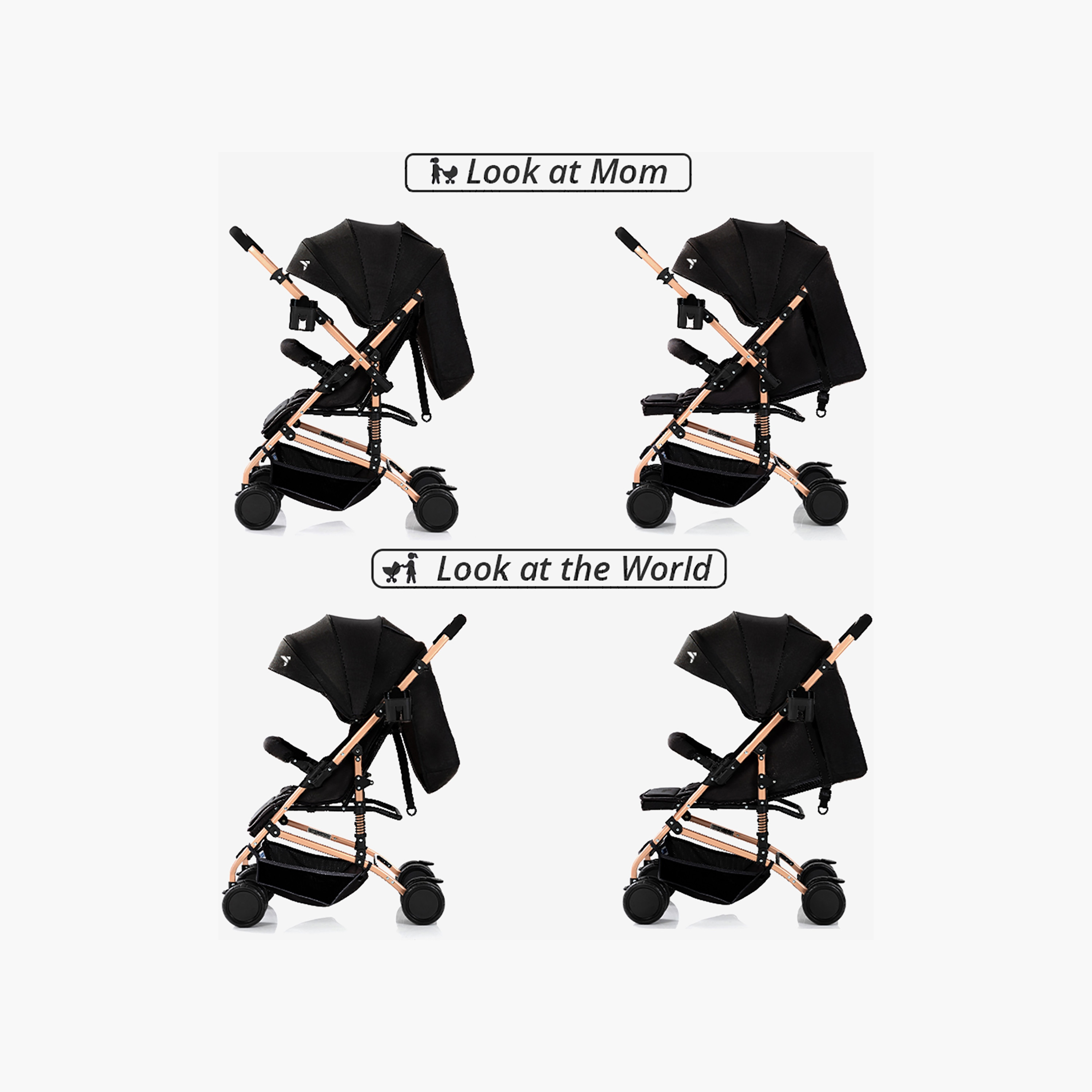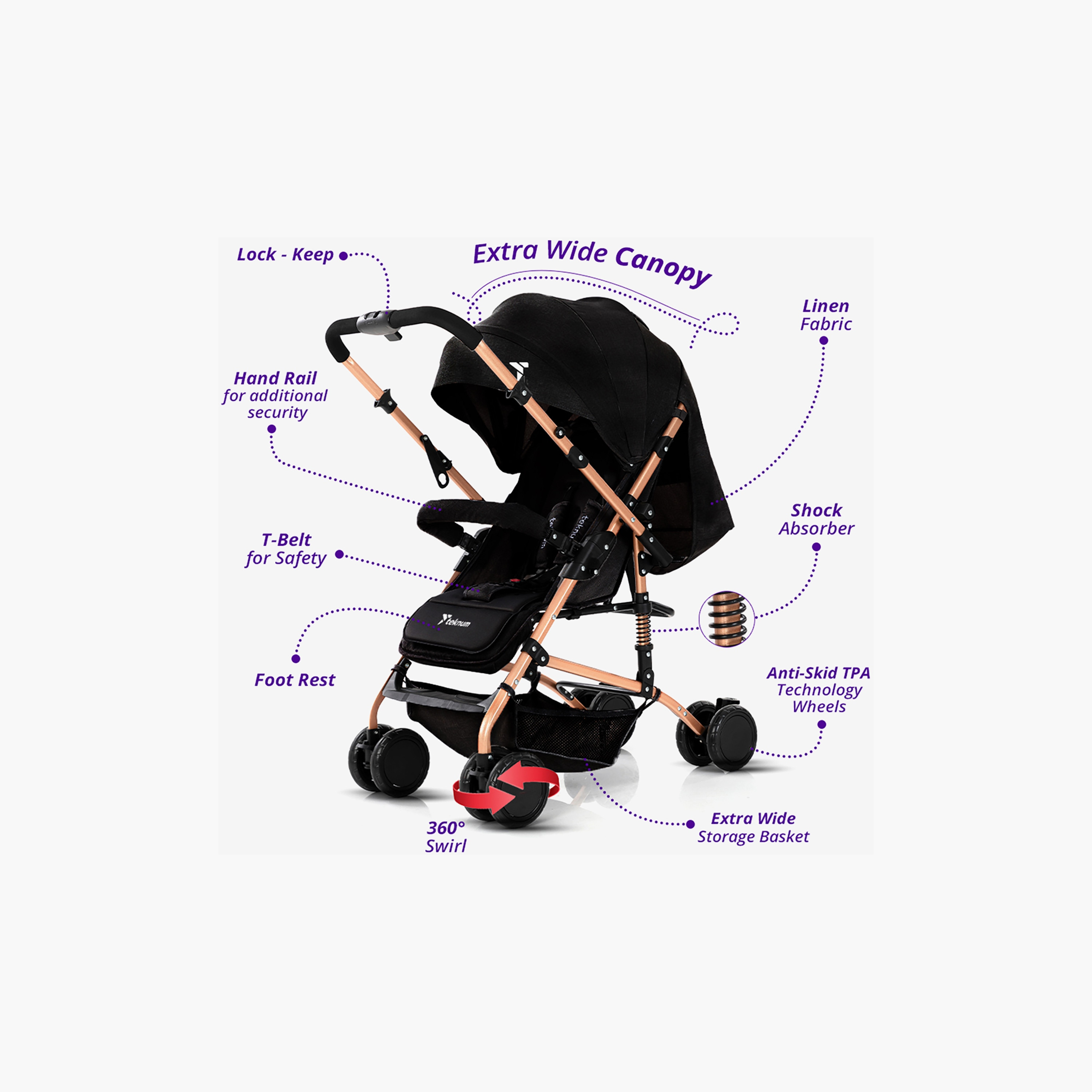 Front-wheel 360-degree swirl with locking system. Extra wide stylish canopy. A gold frame adds to the look.